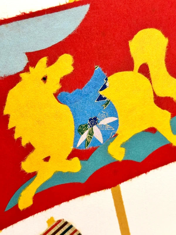 Framed on a classic square shikishi board, this piece is signed with a red artist seal, affirming its handcrafted authenticity. A striking piece of seasonal folk art, this Chigiri-e card combines cultural symbolism with joyful color and texture—perfect for display or as a collector’s item imbued with energy and good fortune.