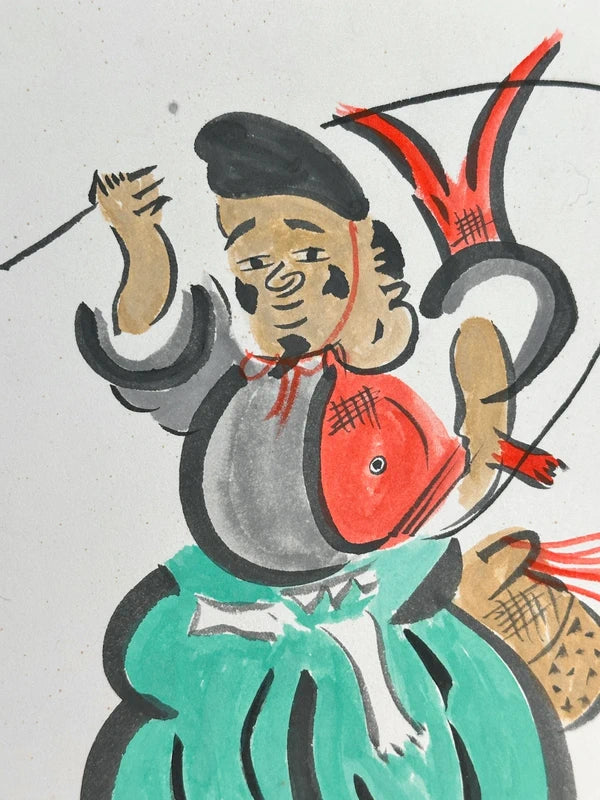 Rendered in expressive brushstrokes and bold traditional colors, Ebisu is shown joyfully holding his signature fishing rod and a large red sea bream (tai / 鯛)—symbols of bounty and celebratory fortune. His oversized green trousers and distinctive court-style cap (kazaori eboshi) give him a cheerful and familiar look, often associated with New Year festivities and merchant talismans.