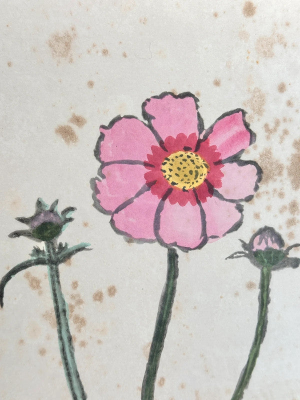 The artwork features a cosmos flower in bloom, in delicate pink hues with a yellow center, flanked by two buds, symbolizing growth, vitality, and renewal. The brushstrokes are simple yet full of life, embodying the charm of Japanese bokuseki traditions.