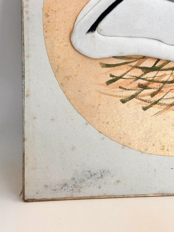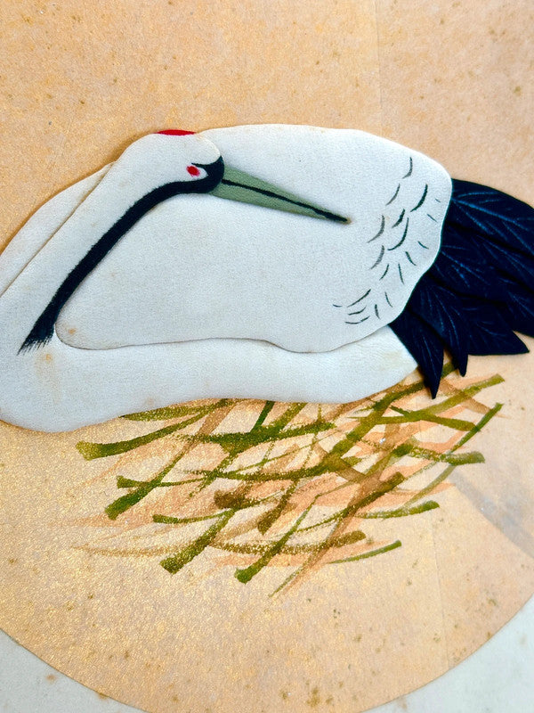 This vintage shikishi art card features a serene depiction of a resting crane (仙鶴, senkaku), it using finely cut and layered Nishijin-ori (西陣織) fabric. The crane is elegantly composed in a circular gold-leafed background, symbolizing harmony and eternity.