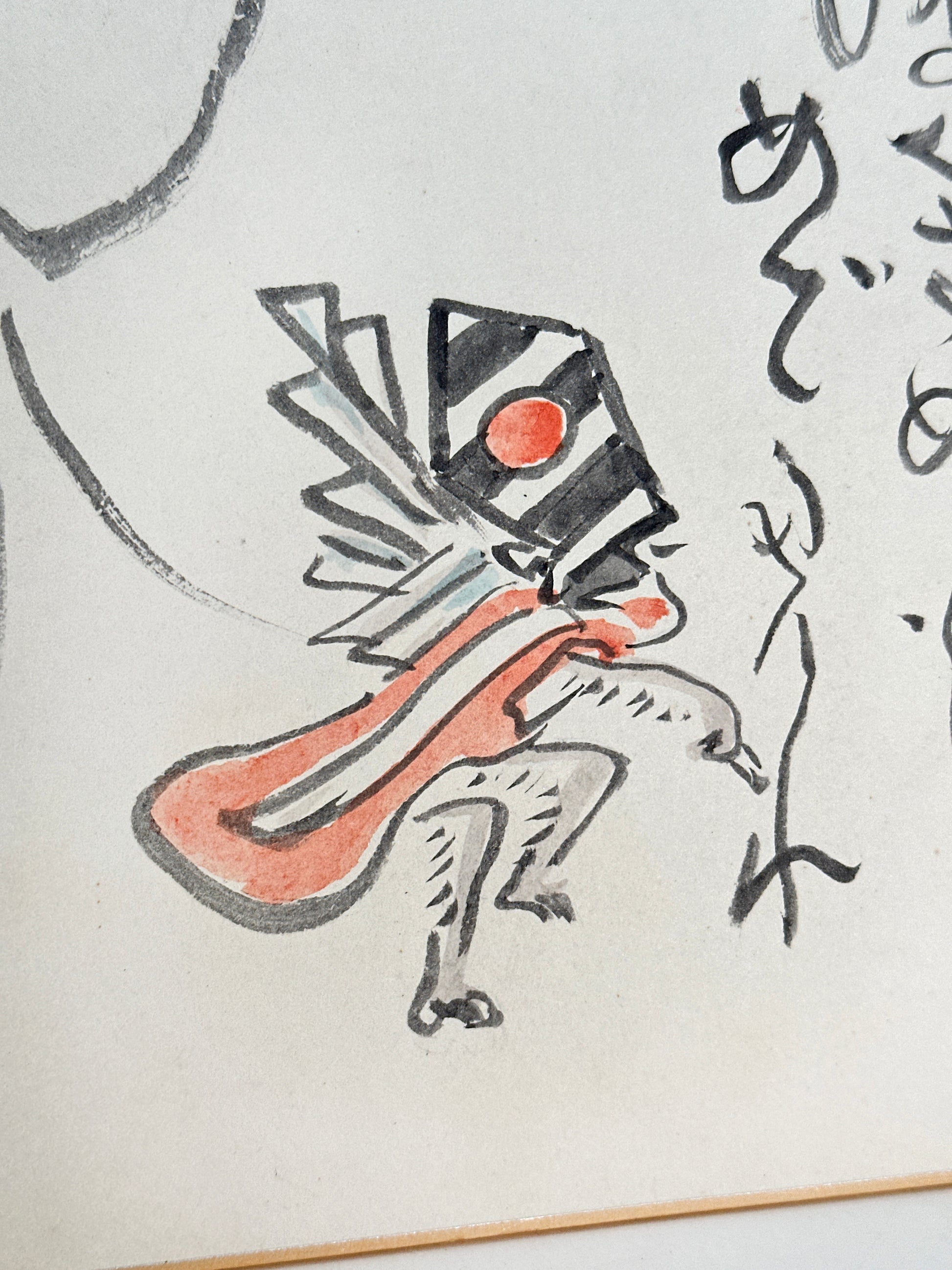 This shikishi artwork depicts 猿回し (saru-mawashi), the traditional Japanese street performance in which a handler guides a trained monkey through playful tricks and gestures. Rendered in a light, spontaneous brush style, the scene captures a fleeting moment of interaction: the elderly handler symbols longevity leans forward with quiet authority, while the monkey—dressed in a small costume with a flowing red accent—springs into motion, animated and expressive.