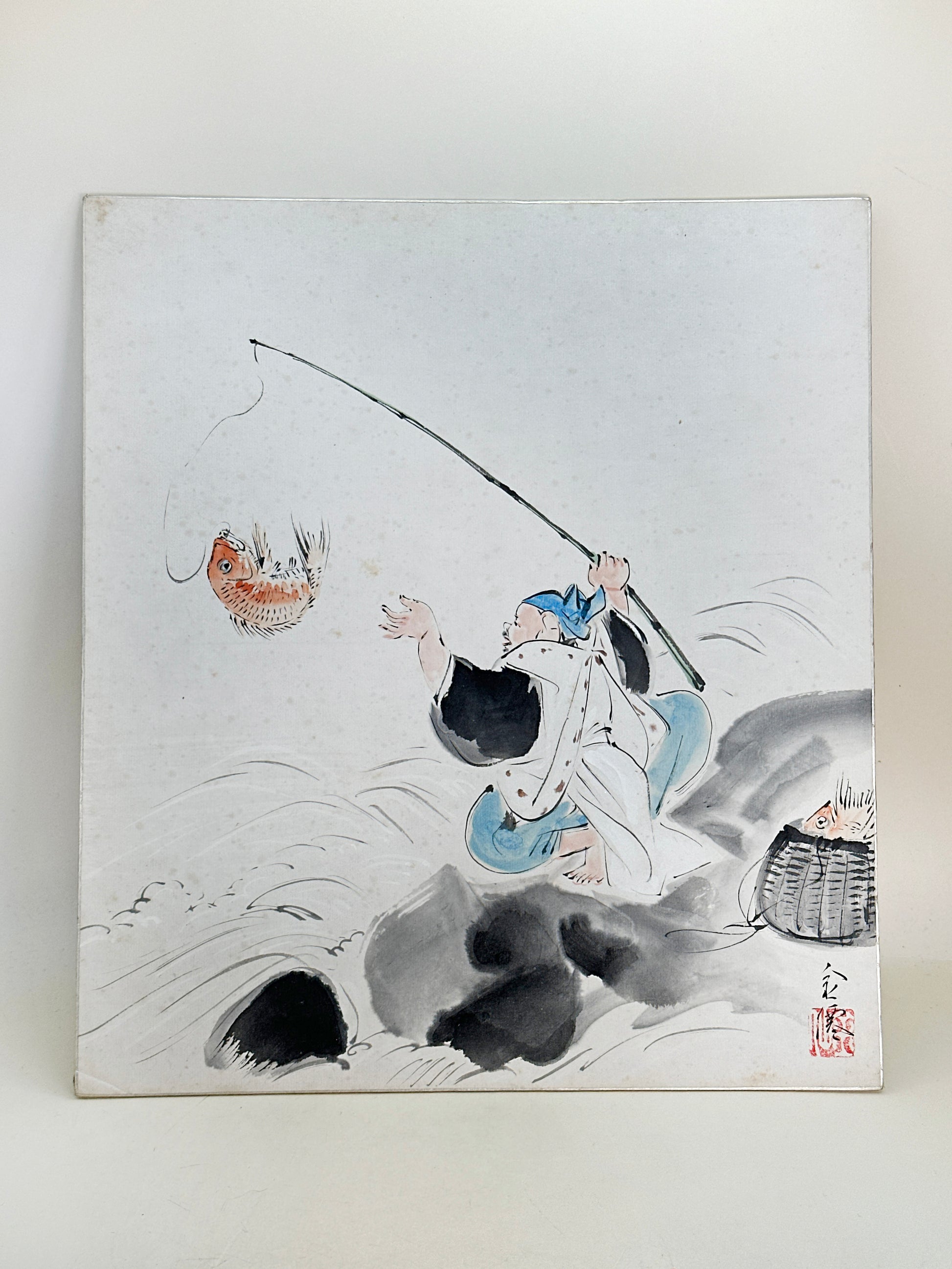This shikishi artwork presents a lively and auspicious depiction of Ebisu 恵比寿, one of Japan’s Seven Gods of Good Fortune, rendered with warmth and motion in ink and light color washes. The scene captures Ebisu mid-action, standing barefoot on rugged rocks by the water’s edge, joyfully casting his fishing rod. A freshly caught sea bream (tai) leaps from the water, its bright orange-red tones standing out against the soft greys of the waves and rocks.