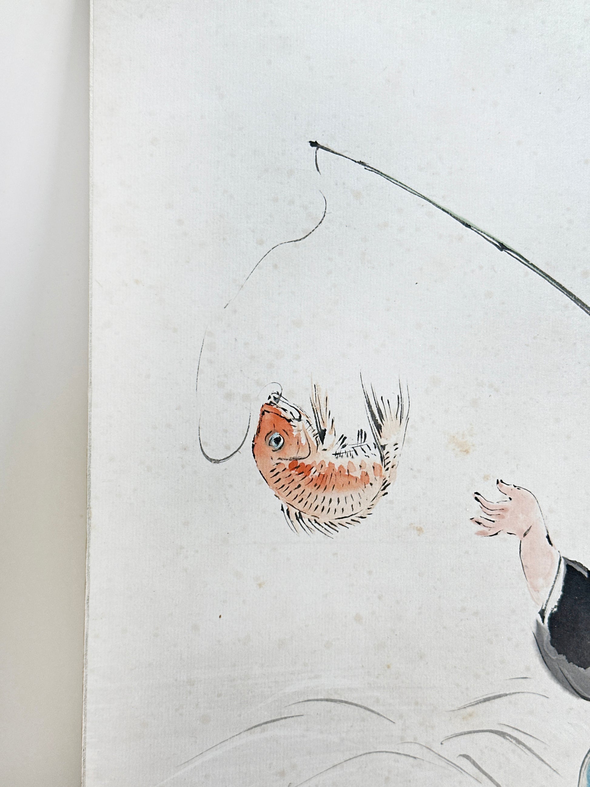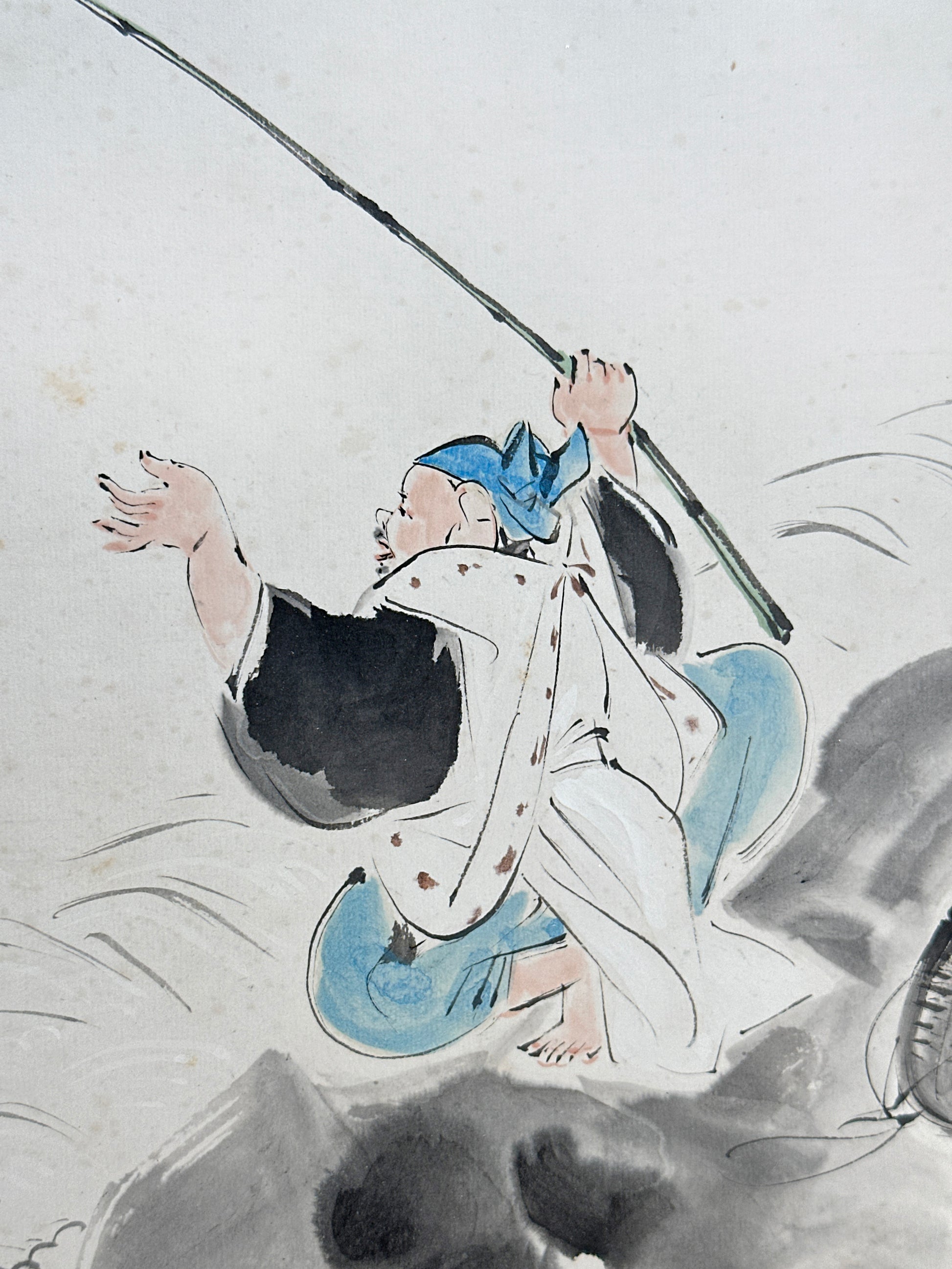 Ebisu is traditionally portrayed as a cheerful fisherman, symbolizing prosperity, honest labor, abundant harvests, and good fortune, especially in business and daily life. His relaxed posture, smiling expression, and dynamic movement here emphasize his approachable, benevolent character. The flowing brushwork conveys the rhythm of the sea, while the restrained palette—punctuated by touches of blue in his garments and the vivid fish—keeps the composition light and joyful.