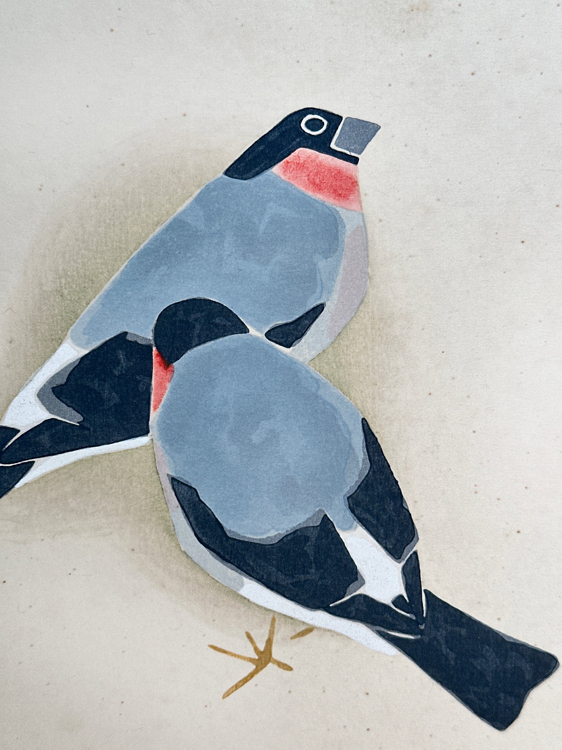 The composition features two delicately rendered birds resting quietly upon the open surface of the paper, their forms simplified yet carefully balanced. Painted in soft mineral-like tones of blue-gray, charcoal, and muted rose, the birds display subtle contrasts: dark wings and tails anchor their bodies, while a gentle blush at the throat adds warmth and life. Their rounded forms and overlapping placement create a sense of companionship and calm intimacy.