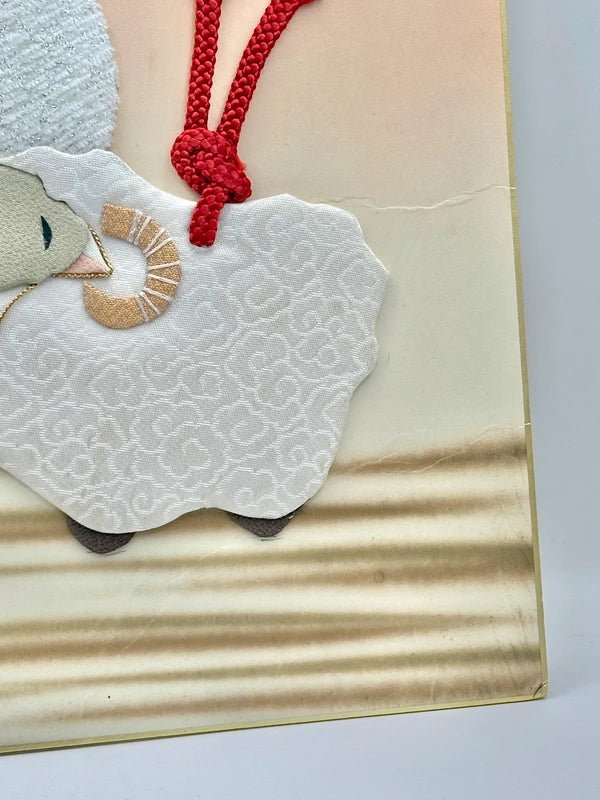A vintage Japanese Shikishi Artwork – Zodiac Sheep (Hitsuji / 羊) features a delicate and charming textile appliqué of two sheep (hitsuji), a symbolic animal of the Japanese zodiac. Meticulously handcrafted, the sheep are made from textured white fabric with soft swirling patterns, enhanced with embroidered details and red decorative cords (mizuhiki-style) tied into traditional knots. One sheep carries a small bell, adding a hint of festivity and fortune.