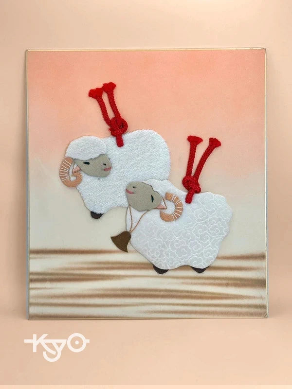 The background of the card transitions from a warm peachy gradient to a serene ivory, evoking the gentle light of dawn or the changing seasons. The combination of minimalism and intricate fabric artistry exemplifies the Japanese aesthetic of harmony, softness, and symbolic meaning. In the Japanese zodiac, the sheep (8th in the 12-year cycle) is associated with peace, compassion, and family warmth. Shikishi cards like this are often used for seasonal greetings, calligraphy, or framed as decorative art in the home.
