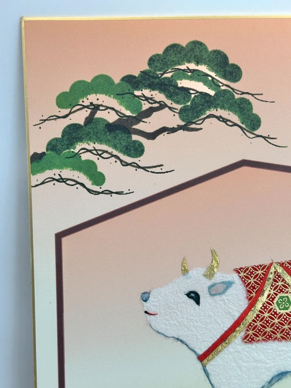 Japanese Chigiri-e Shikishi Art – Year of the Ox (丑年) with Pine Tree Motif crafted chigiri-e (ちぎり絵) collage, depicting a white ox (cow) adorned in a festive red and gold ornamental cloth. The ox is framed within the shape of an ema (絵馬)—a wooden votive plaque used in Shinto shrines for prayers and wishes. This design celebrates the Year of the Ox (丑年 – Ushidoshi) in the Japanese zodiac.