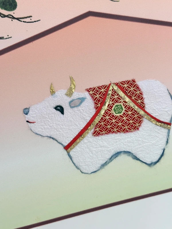 Created using the chigiri-e method, the ox and its intricate blanket are formed with hand-torn washi paper, giving the piece texture, softness, and depth. The rich detailing and tactile quality make this more than just a visual piece—it's art you can feel.