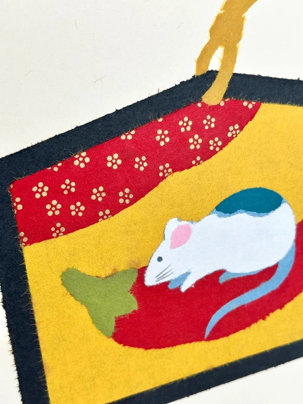 Rendered in bold and vivid hues using dyed washi paper, this Chigiri-e scene blends festive cheer with traditional meaning. In Japanese culture, the mouse (nezumi) is closely associated with Daikokuten, one of the Seven Lucky Gods and a deity of wealth and prosperity. As the first animal in the zodiac, the mouse also represents new beginnings, fertility, and intelligence.