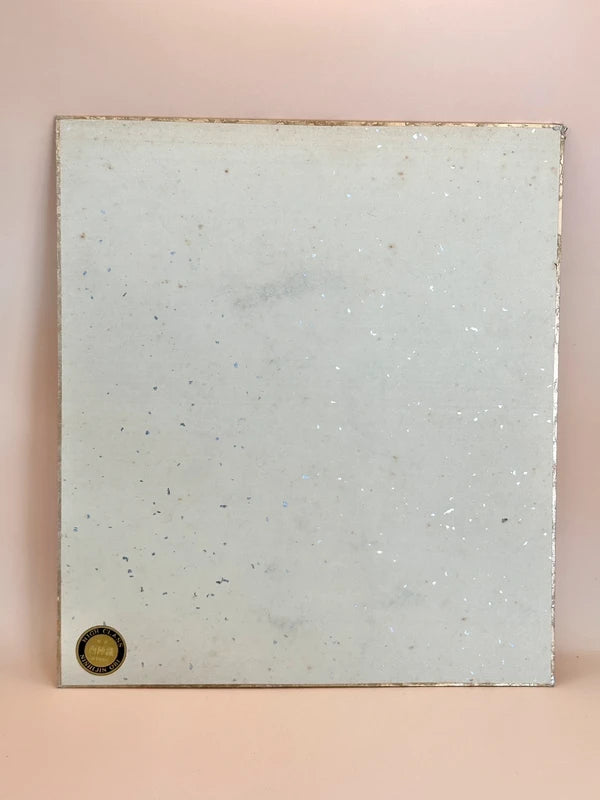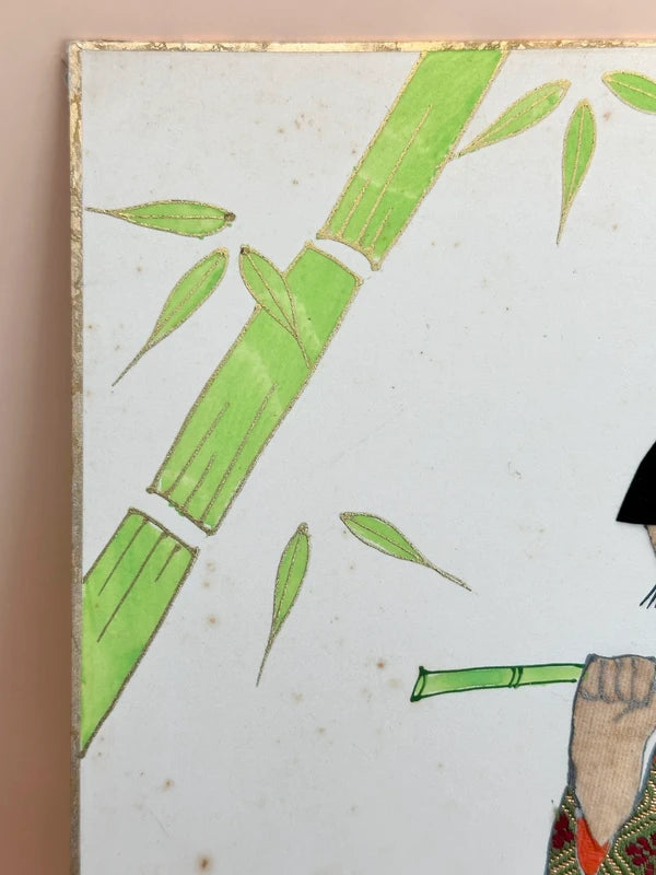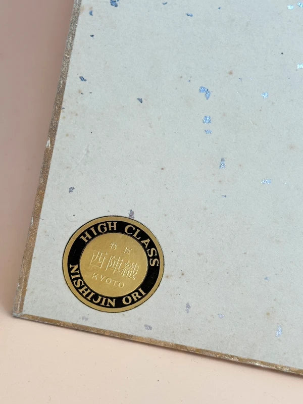 A vintage shikishi art card features a collage made from luxurious Nishijin-ori (西陣織) which produced in the Nishijin district of Kyoto, with a history that dates back over 1,200 years. It is renowned for its intricate weaving techniques, vivid colors, and use of luxurious materials such as silk and gold or silver threads.