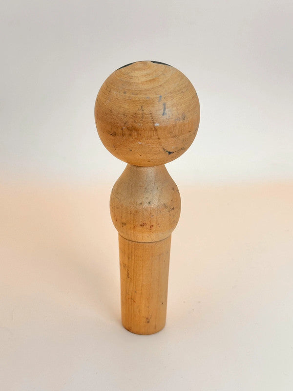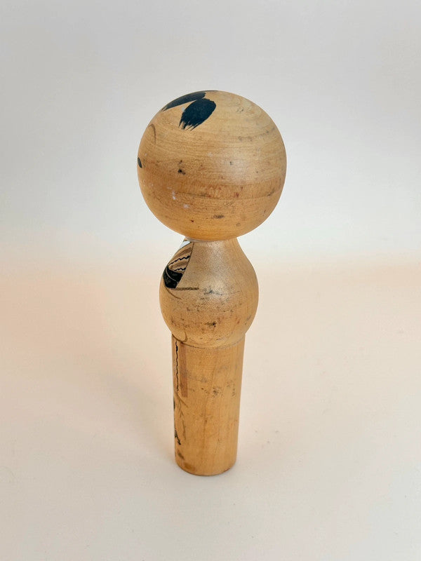 A vintage Sosaku Kokeshi doll blending traditional craftsmanship with artistic individuality. Hand-carved from wood and polished to a smooth, natural finish, the doll features a large rounded head with a serene, childlike expression. Its facial features are delicately painted of narrow eyes, a small red mouth, and stylized black hair with distinctive tufts on top, capturing the gentle and minimalist aesthetic typical of Sosaku Kokeshi.