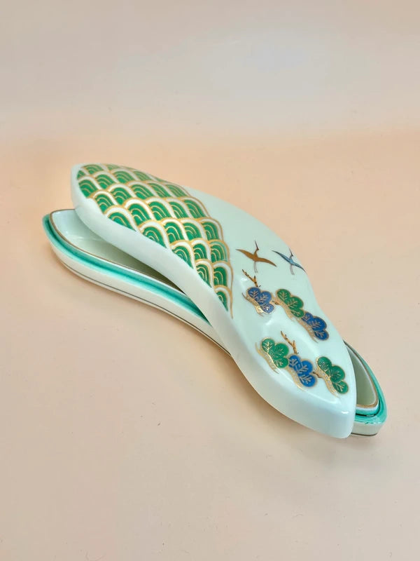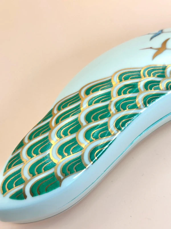 The surface features a series of overlapping semicircles rendered in green and gold, a stylized wave motif known as Seigaiha. Though simple in design, this pattern has ancient roots, once found in clay figurines and in the ceremonial robes of the Heian period. Traditionally associated with the vast ocean and eternal calm, the motif conveys wishes for peace and continuity.