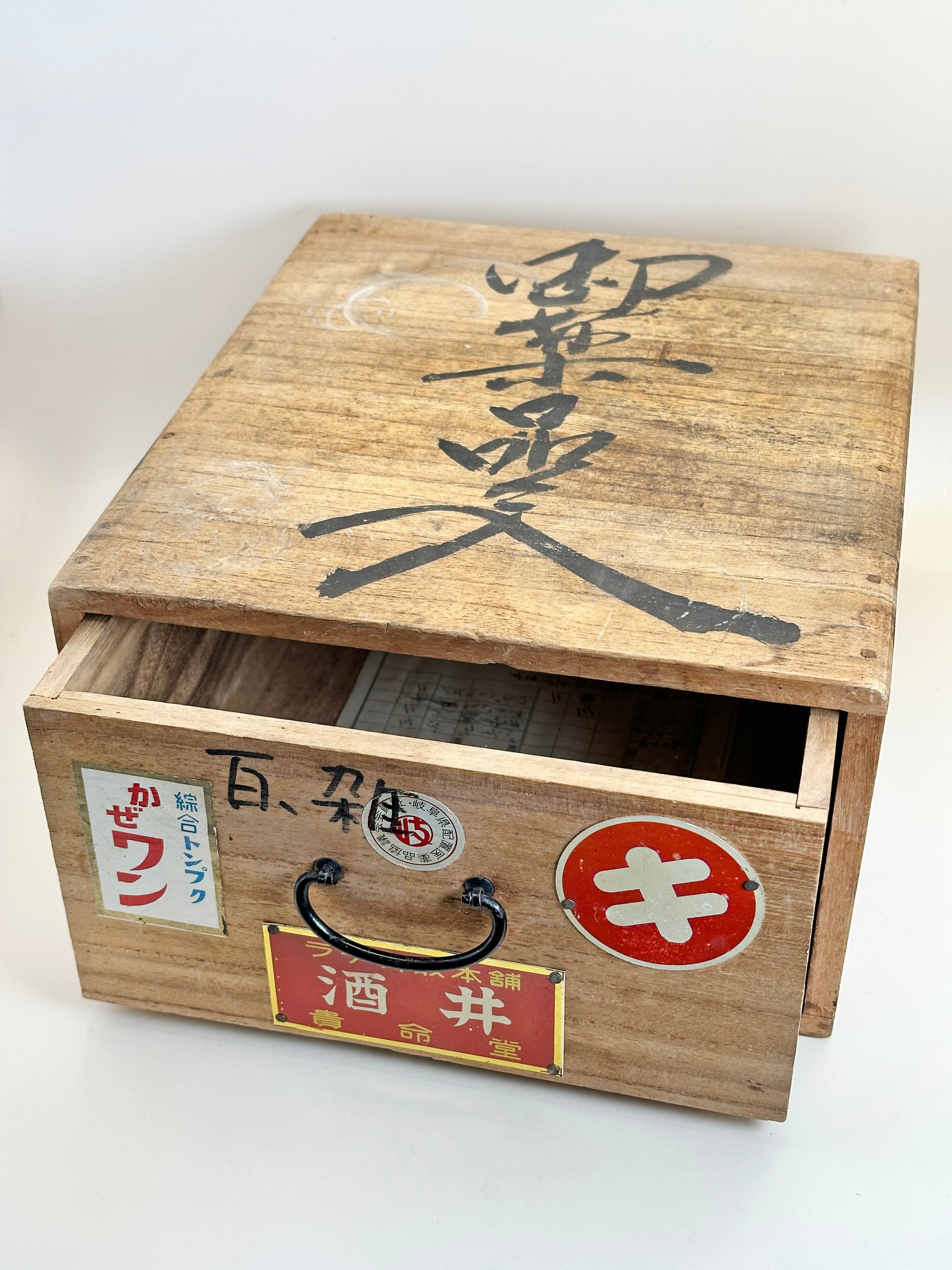This box makes a wonderful decorative storage piece, ideal for stationery, small collectibles, tea utensils, or as a striking interior accent in a wabi-sabi or Japanese folk-inspired space. It also appeals strongly to collectors of Japanese antiques, pharmacy history, or traditional folk artifacts. A rare and atmospheric piece of Japanese everyday history, blending utility, craftsmanship, and storytelling.