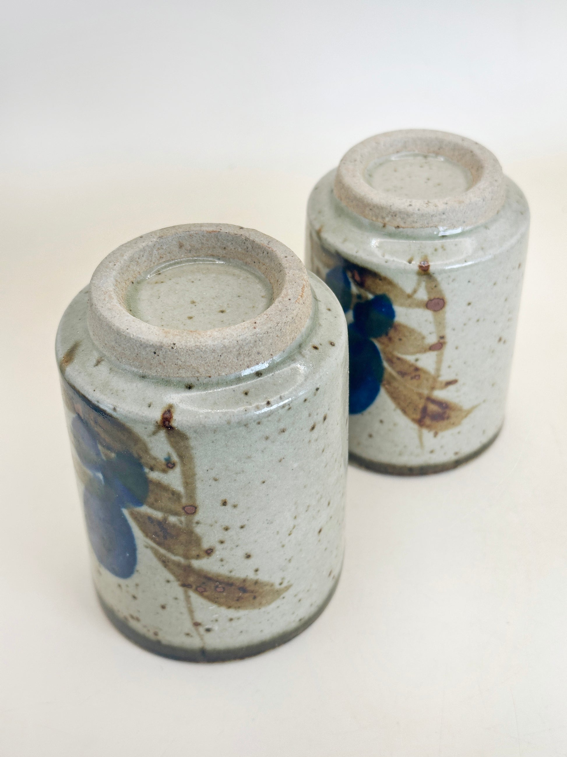 Each cup features a softly speckled, pale ash glaze accented with freehand cobalt-blue brushwork and earthy brown motifs. The organic patterns and subtle variations reveal the hand of the potter, making each cup unique while remaining harmonious as a pair. A darker, gently flowing glaze pools around the rim, adding depth and character typical of Mashiko firing techniques.
