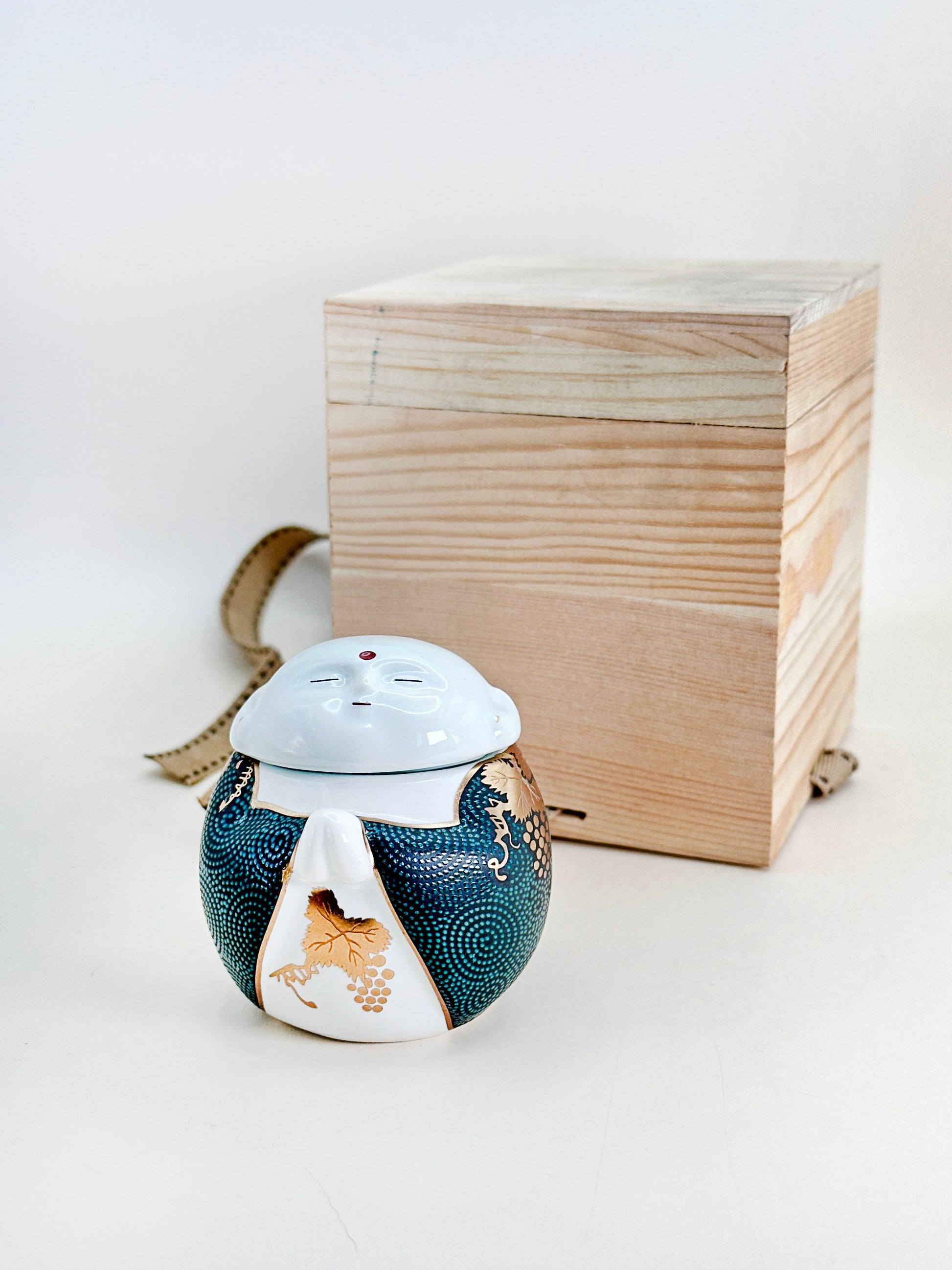 Jizō’s gentle, serene expression is rendered in a soft celadon-toned lid forming the head, subtly painted with minimal features that convey calm and benevolence. The rounded body is decorated in rich emerald-green tones with rhythmic circular patterns, accented by elegant gold-painted grape vines and leaves. In Japanese symbolism, grapes represent abundance, continuity, and prosperity, harmonizing beautifully with Jizō’s role as a benevolent guardian.
