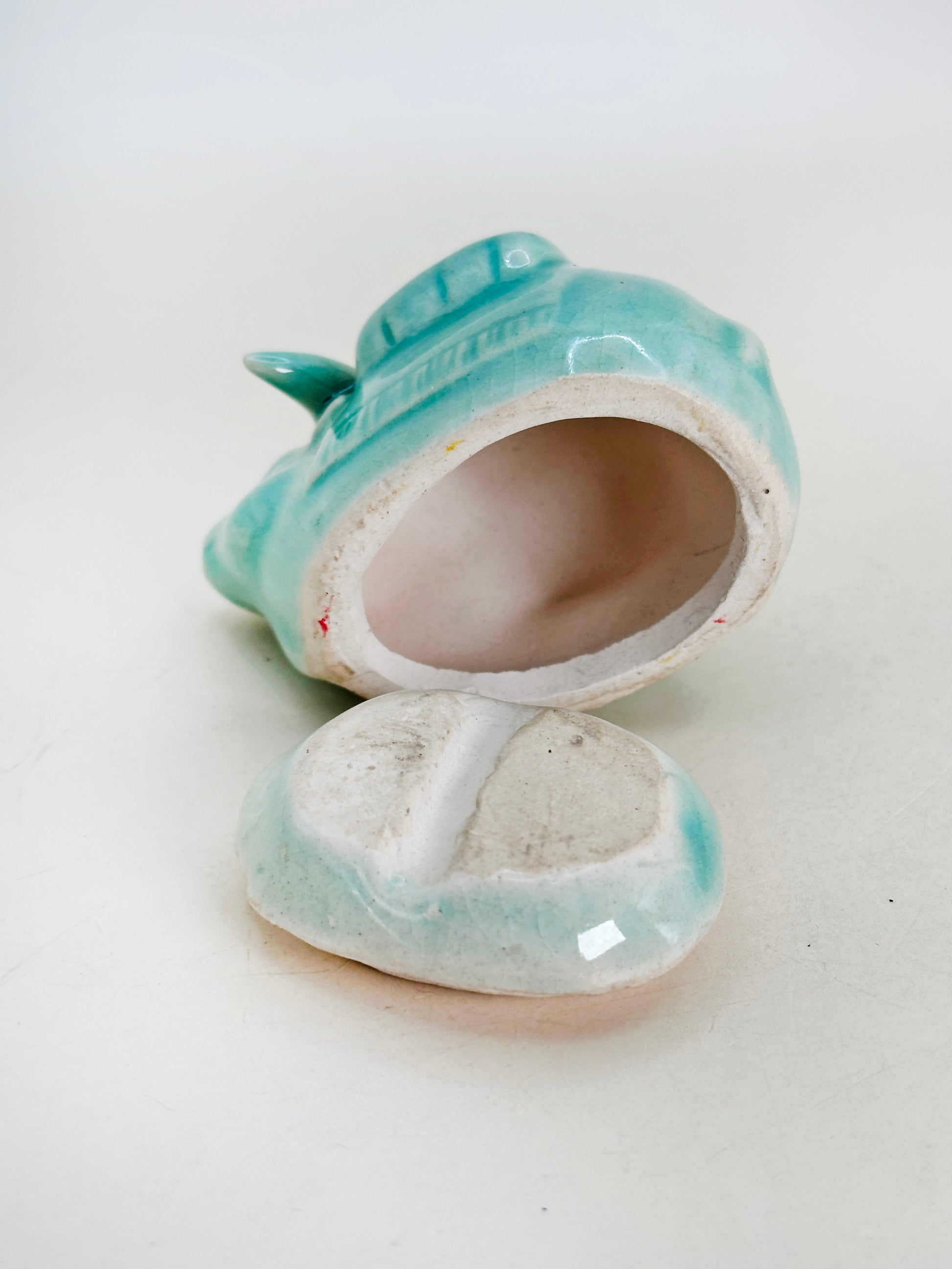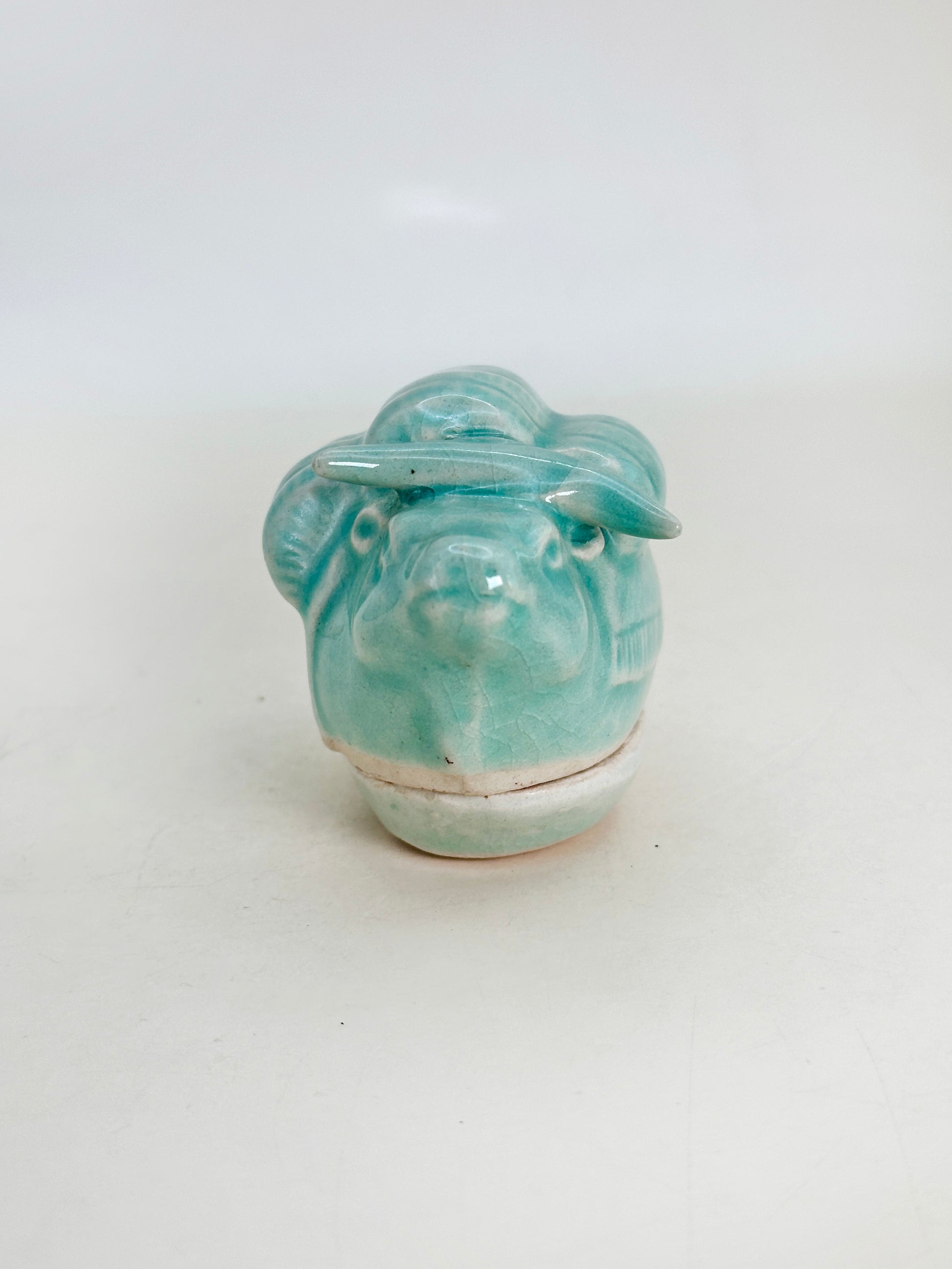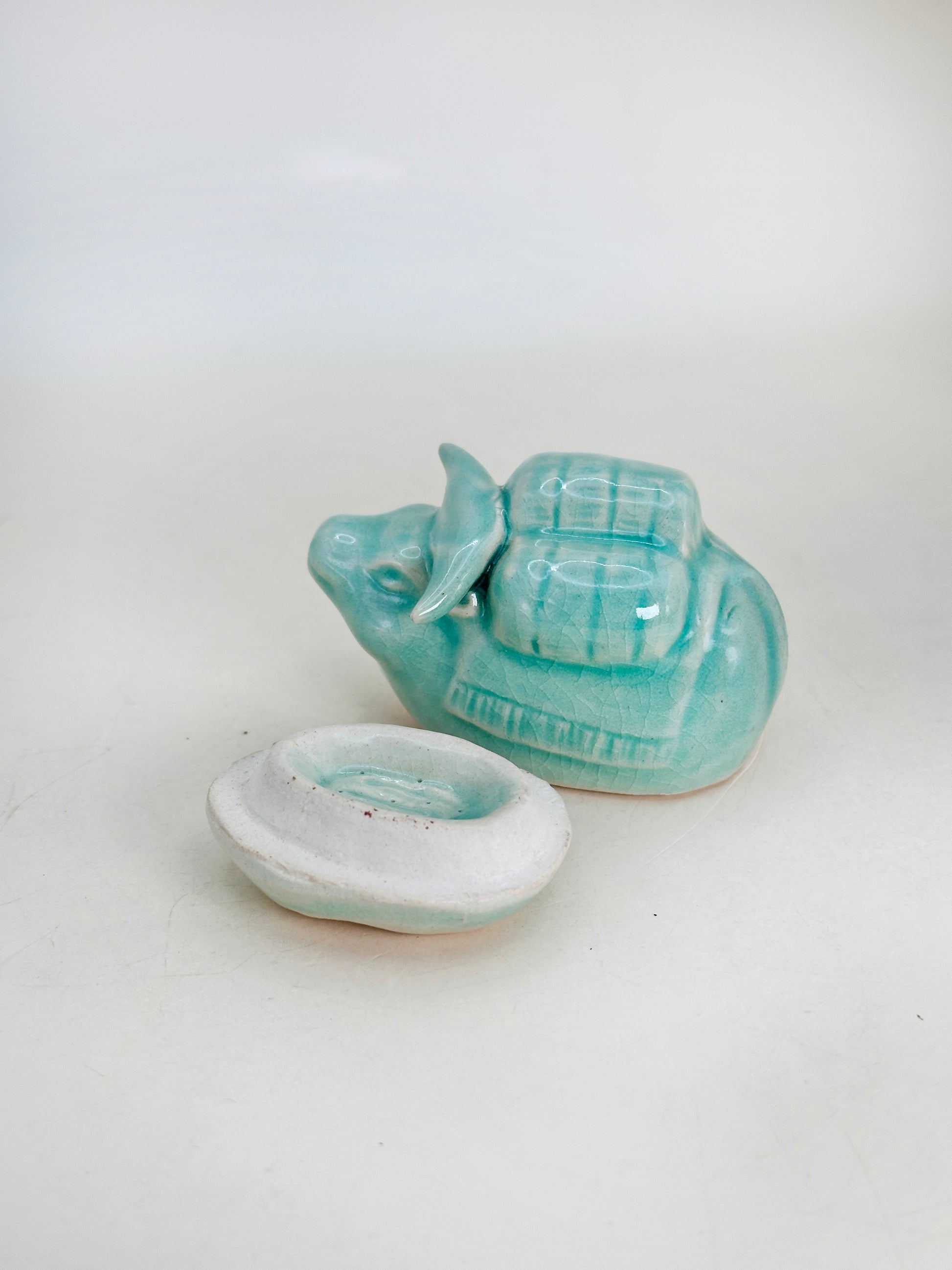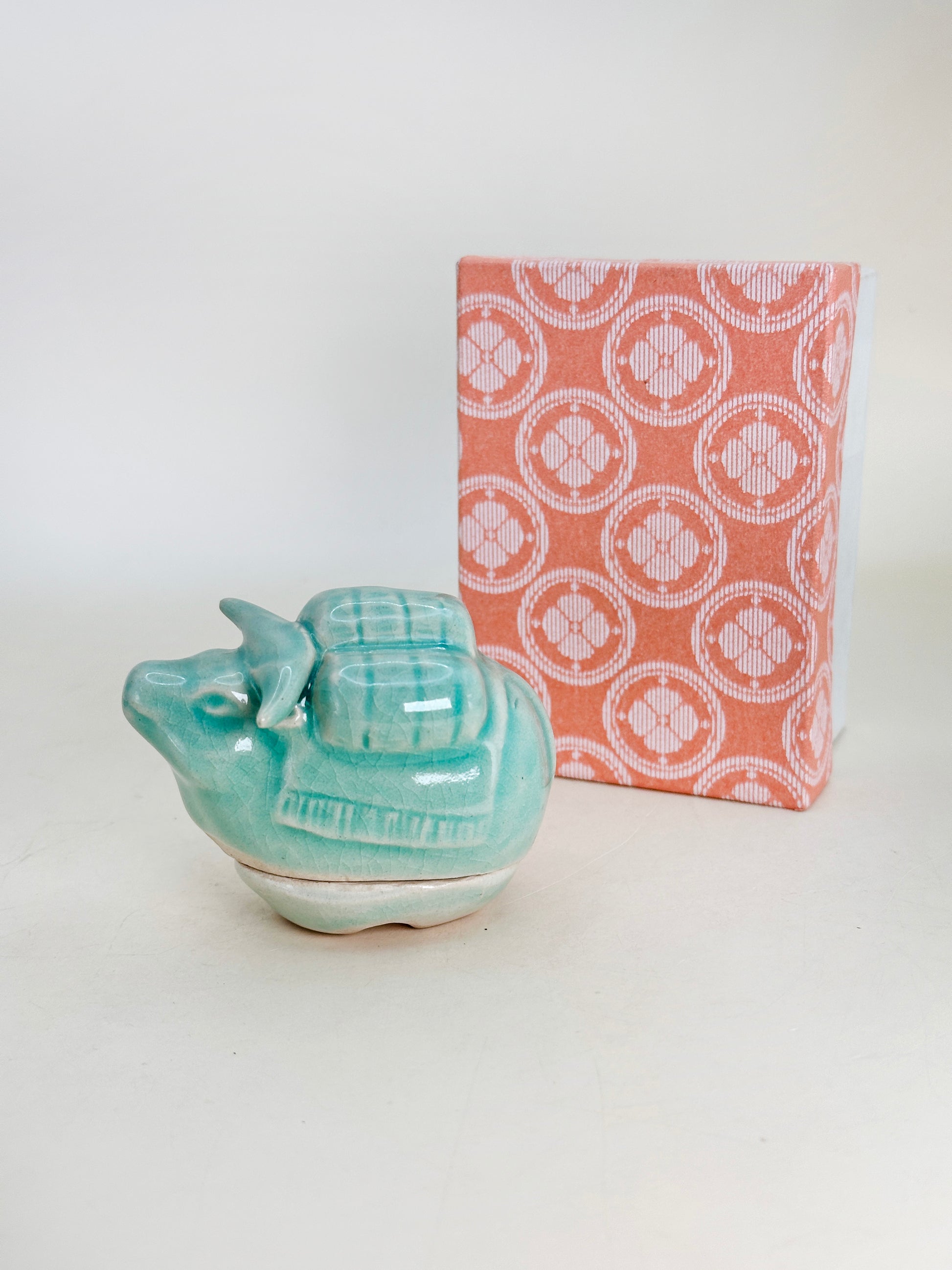 This vintage kōgō (香盒) is crafted in the style of Kōrai seiji (高麗青磁), featuring a serene ox carrying fukudawara (福俵)—auspicious rice bales symbolizing prosperity and abundance.