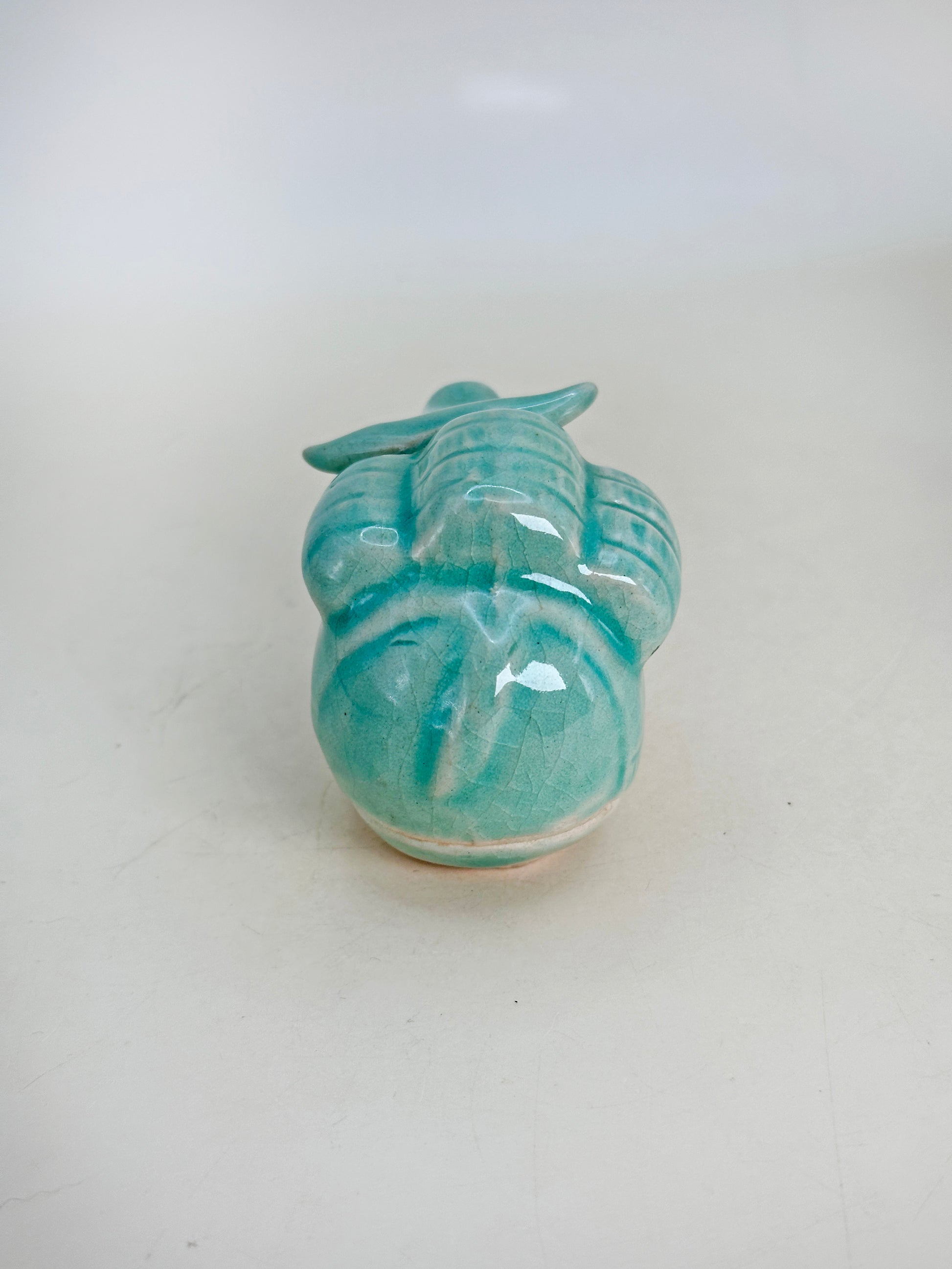 This piece is covered in a luminous celadon glaze of soft jade-green tone, with fine crackle patterns that enhance its depth and classical beauty. The ox is modeled in rounded, harmonious form, its calm expression conveying steadiness and reliability. Resting upon its back are neatly shaped rice bales, a traditional symbol of wealth, good harvest, and good fortune.