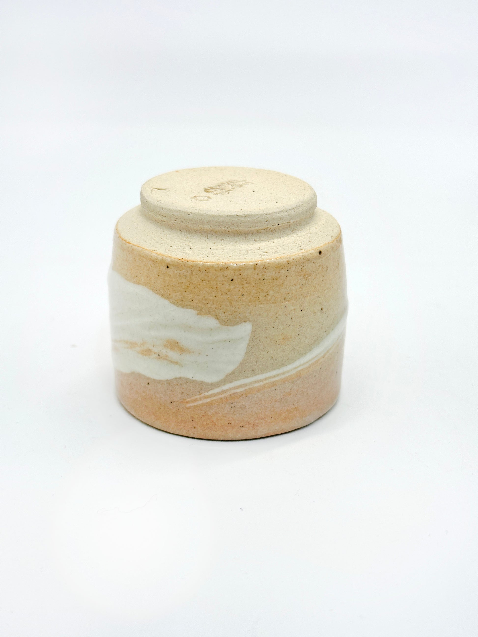 The cup features a gently cylindrical silhouette with softly rounded walls and a neatly finished foot. Its surface is covered in a warm beige glaze, accented by a flowing band of milky white that wraps naturally around the body. The layered glaze creates subtle, landscape-like striations, evoking the calm, earthy character associated with Hagi-style ceramics. Fine speckling in the clay and delicate tonal transitions enhance its understated beauty. The soft gloss and gentle pooling of glaze give depth and warmth, encouraging close appreciation.