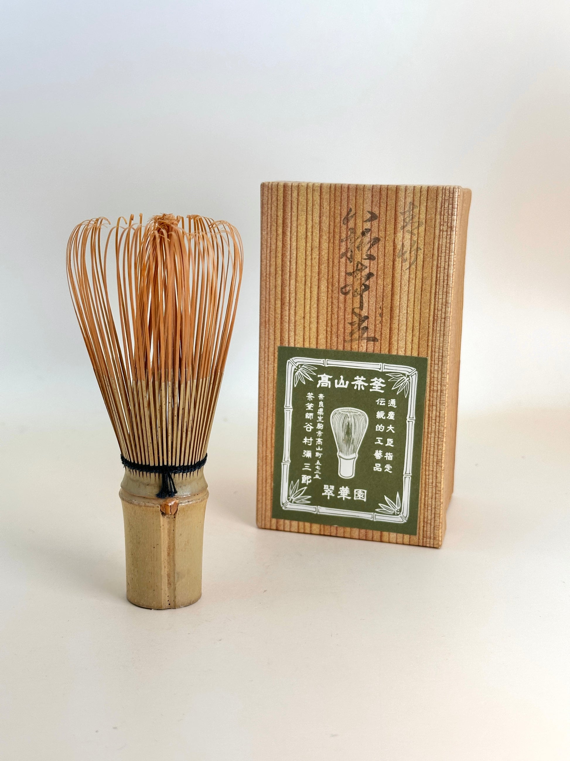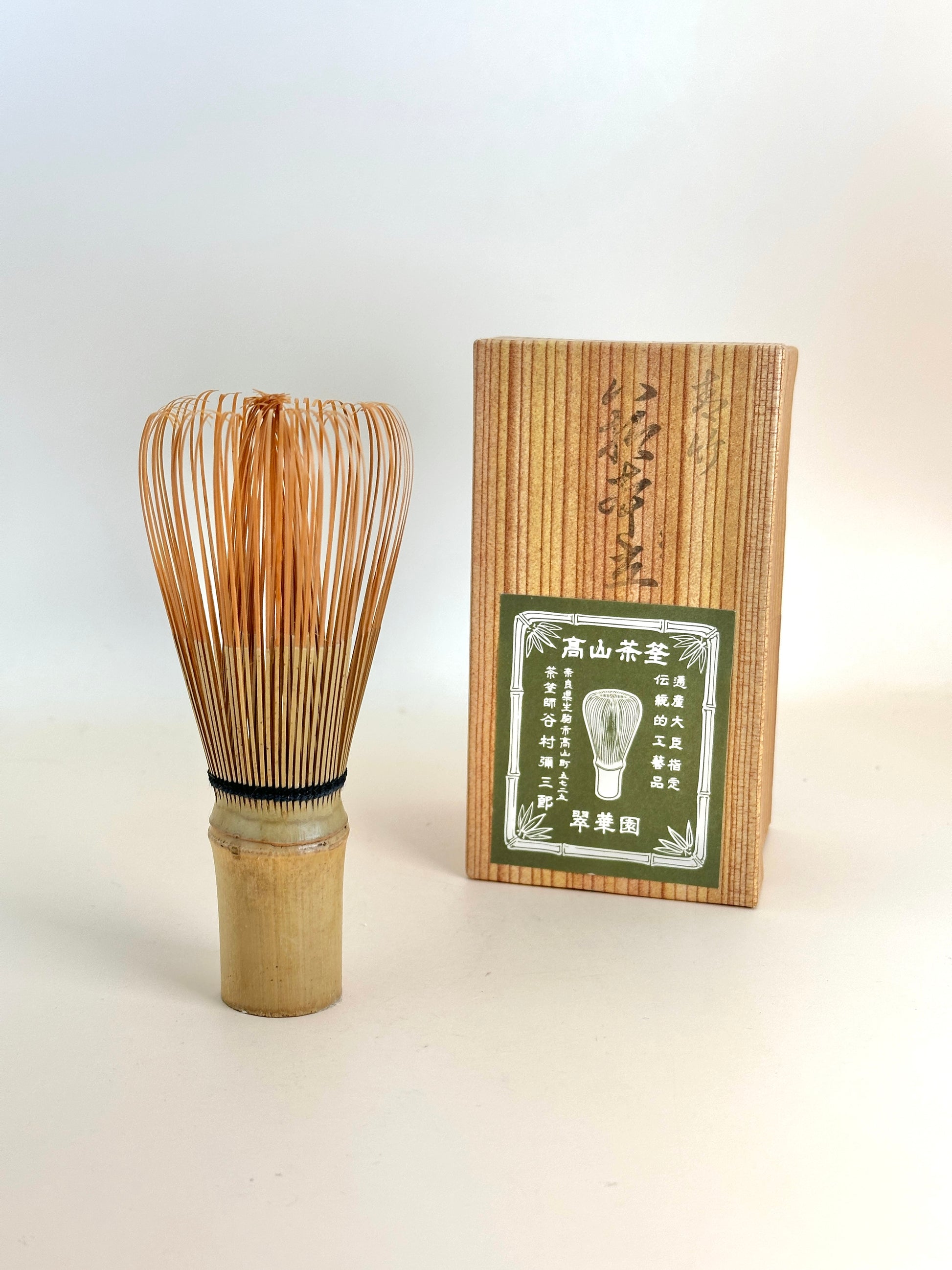 This particular whisk is the work of Master Chasen Craftsman Yasaburō Tanimura (茶筅師 谷村彌三), from the distinguished brand Suikaen (翠華園), which is known for preserving the traditional methods of Takayama Chasen production. Each whisk is carefully carved from a single piece of bamboo and split into delicate prongs, designed to create a fine froth when preparing matcha.