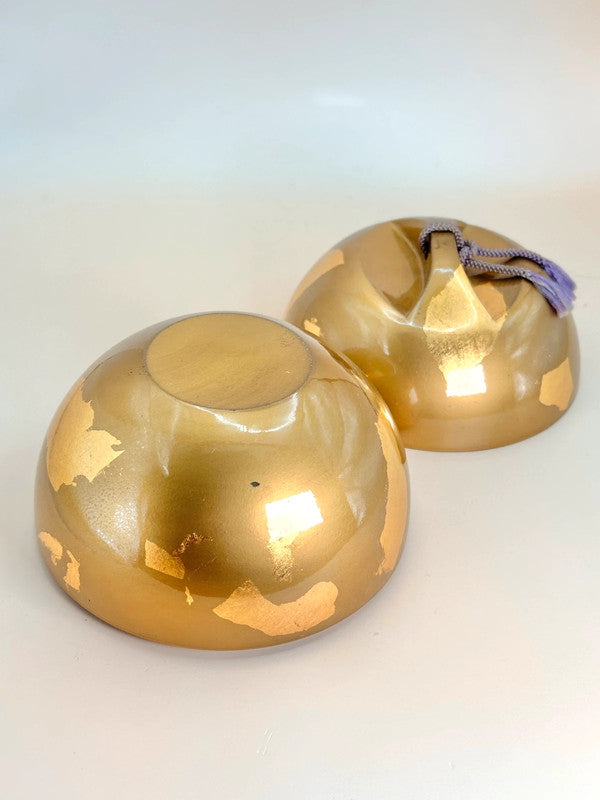 This exquisite lacquerware box is crafted in a rounded, gourd-like form, featuring a striking contrast of deep vermilion red on the interior and radiant gold on the exterior. The golden surface is adorned with irregular patches of gilding that give it a timeless, weathered elegance, reminiscent of traditional Japanese aesthetics.