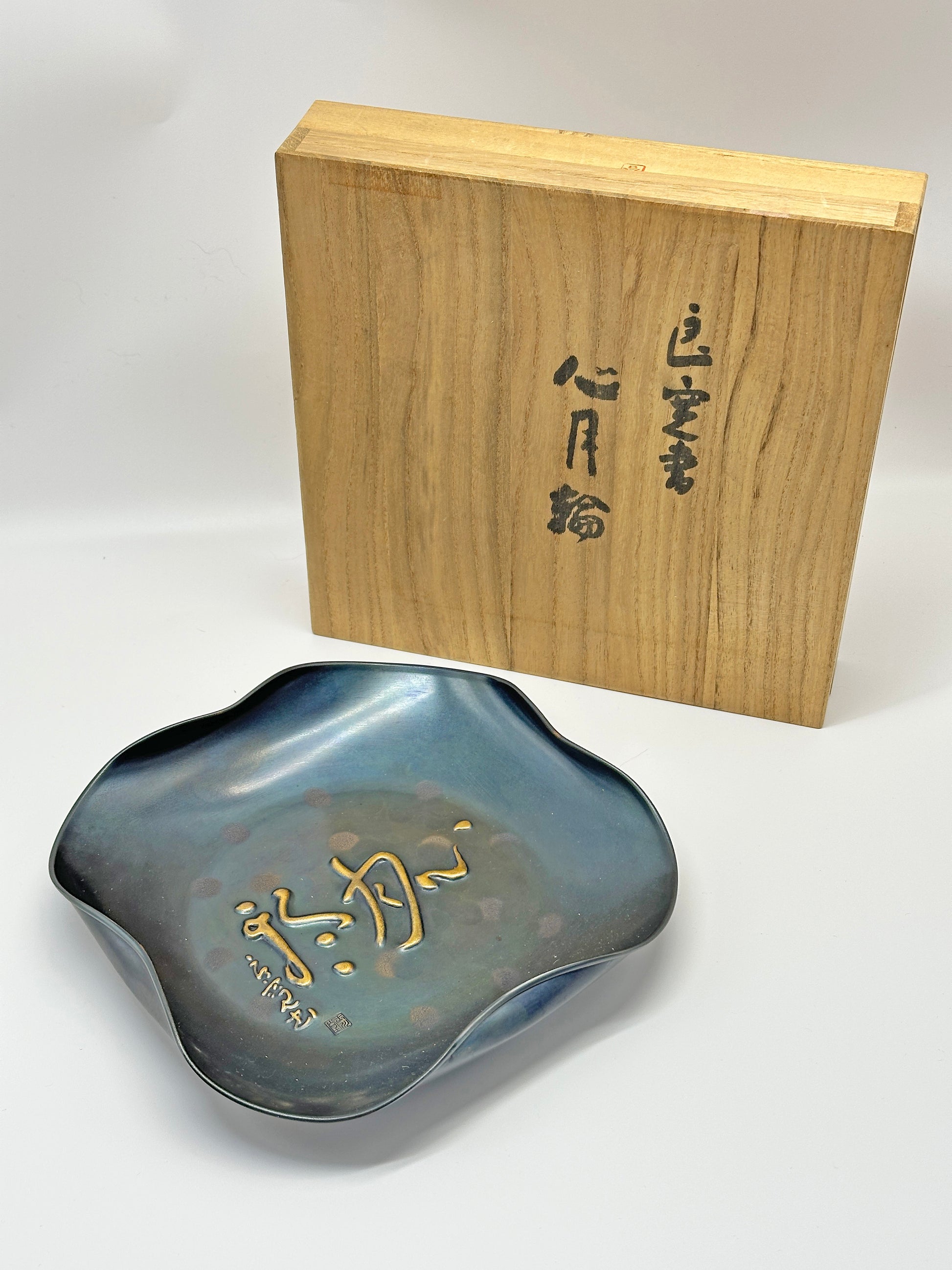 The plate has a gently flowing, organic form with softly undulating edges, evoking the shape of a flower or rippling water. Its surface exhibits a deep iridescent patina of blue and purple hues, achieved through Gyokusendō’s signature coloring techniques, which bring out subtle depth and tonal variations unique to each piece.