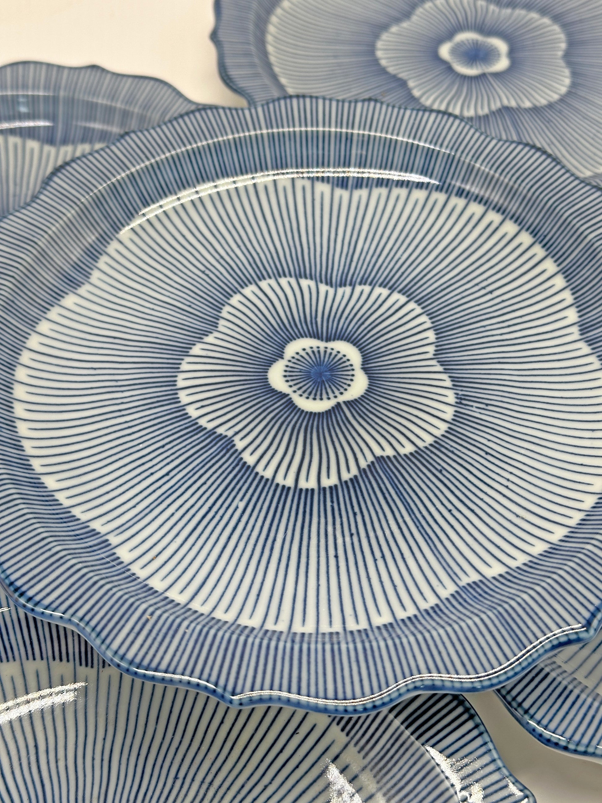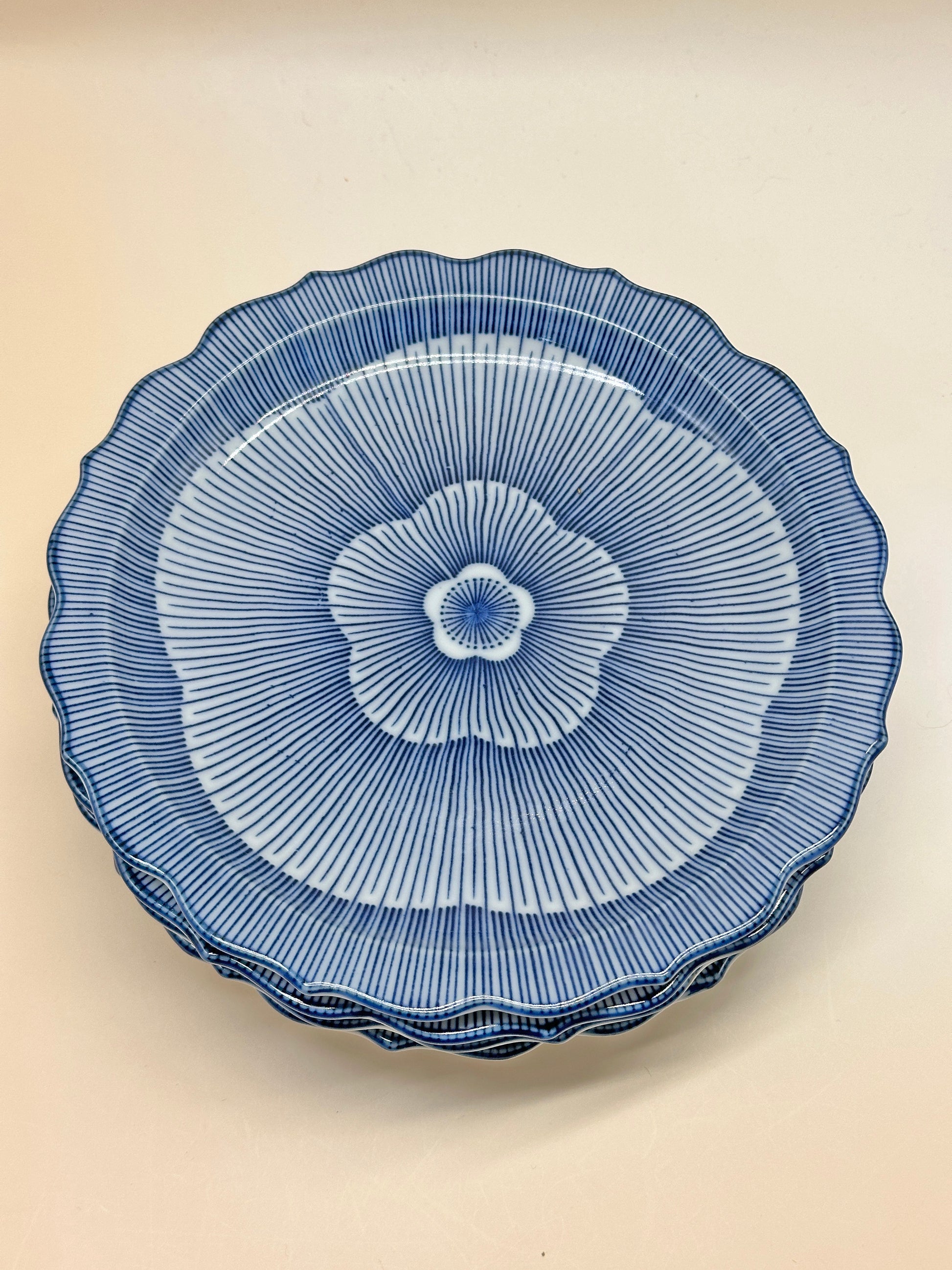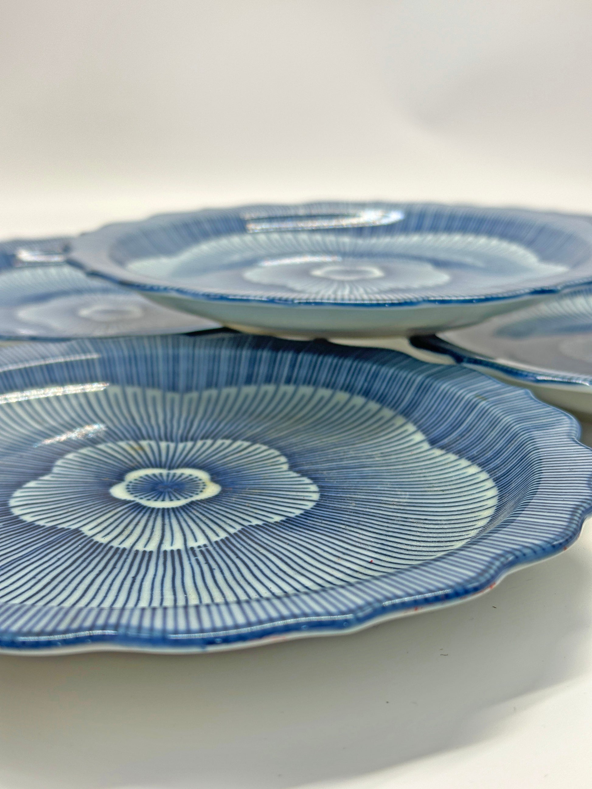 This is a beautiful set of five medium-sized plates featuring a refined plum blossom motif. The design is created with delicate radial blue lines that spread gracefully across the surface, forming the image of a blooming plum flower. Each plate has a softly scalloped rim that adds an elegant touch and enhances the overall sense of refinement.