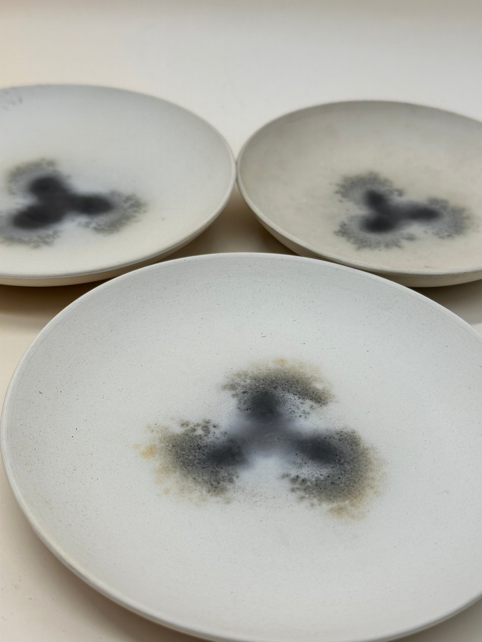 This exquisite set of three hand-thrown ceramic plates embodies the quiet beauty of imperfection and the serene simplicity of Japanese wabi-sabi aesthetics. Each piece carries a unique pattern of soft grey and charcoal blooms that appear like gentle ink dispersions—an echo of natural spontaneity, as if painted by time and fire itself.