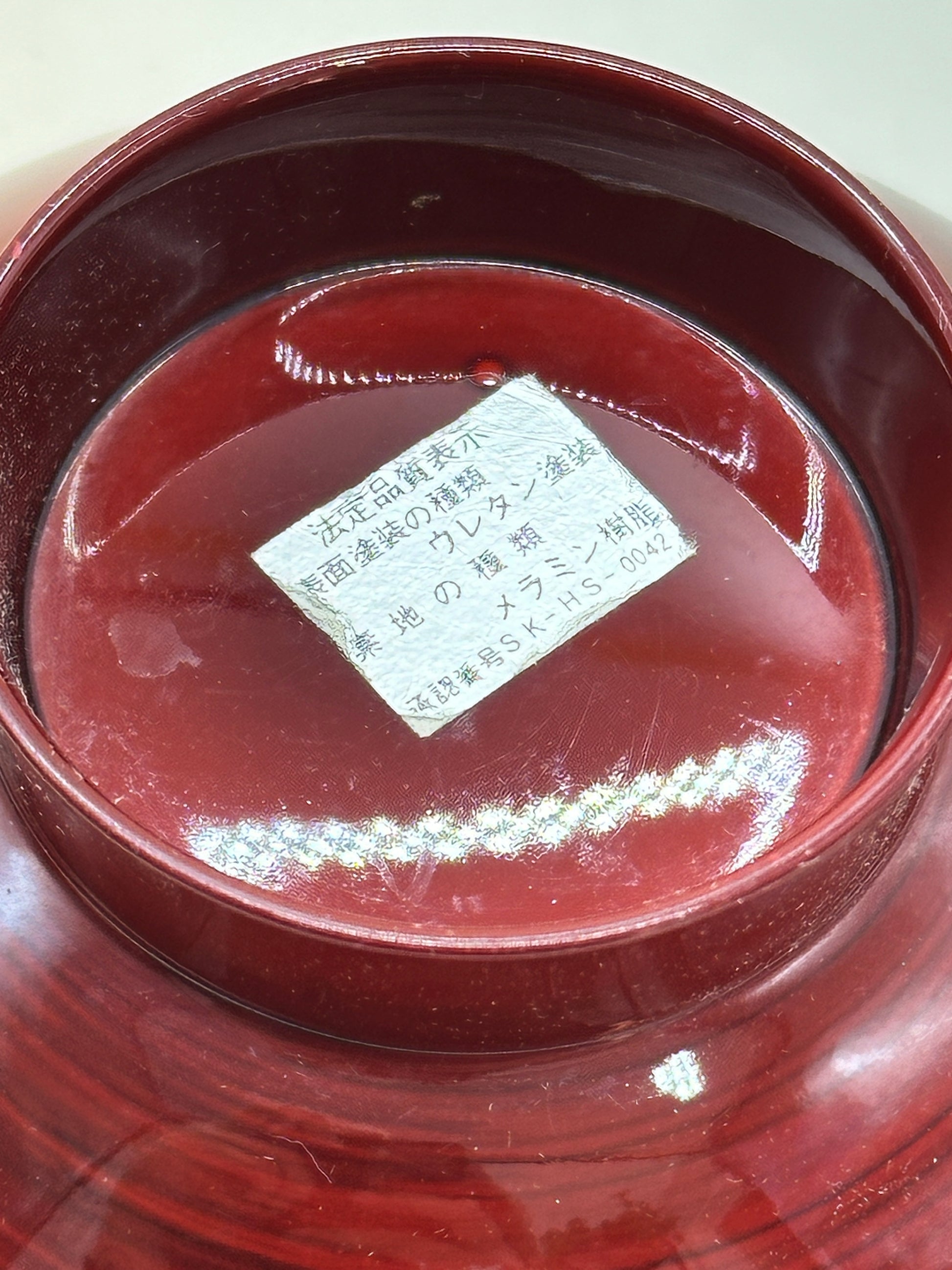 Each bowl is crafted from durable melamine resin with a glossy coating, ensuring both elegance and practicality. The deep red finish showcases a rich texture, complemented by the shimmering gold leaf designs that symbolize longevity and resilience in Japanese culture.