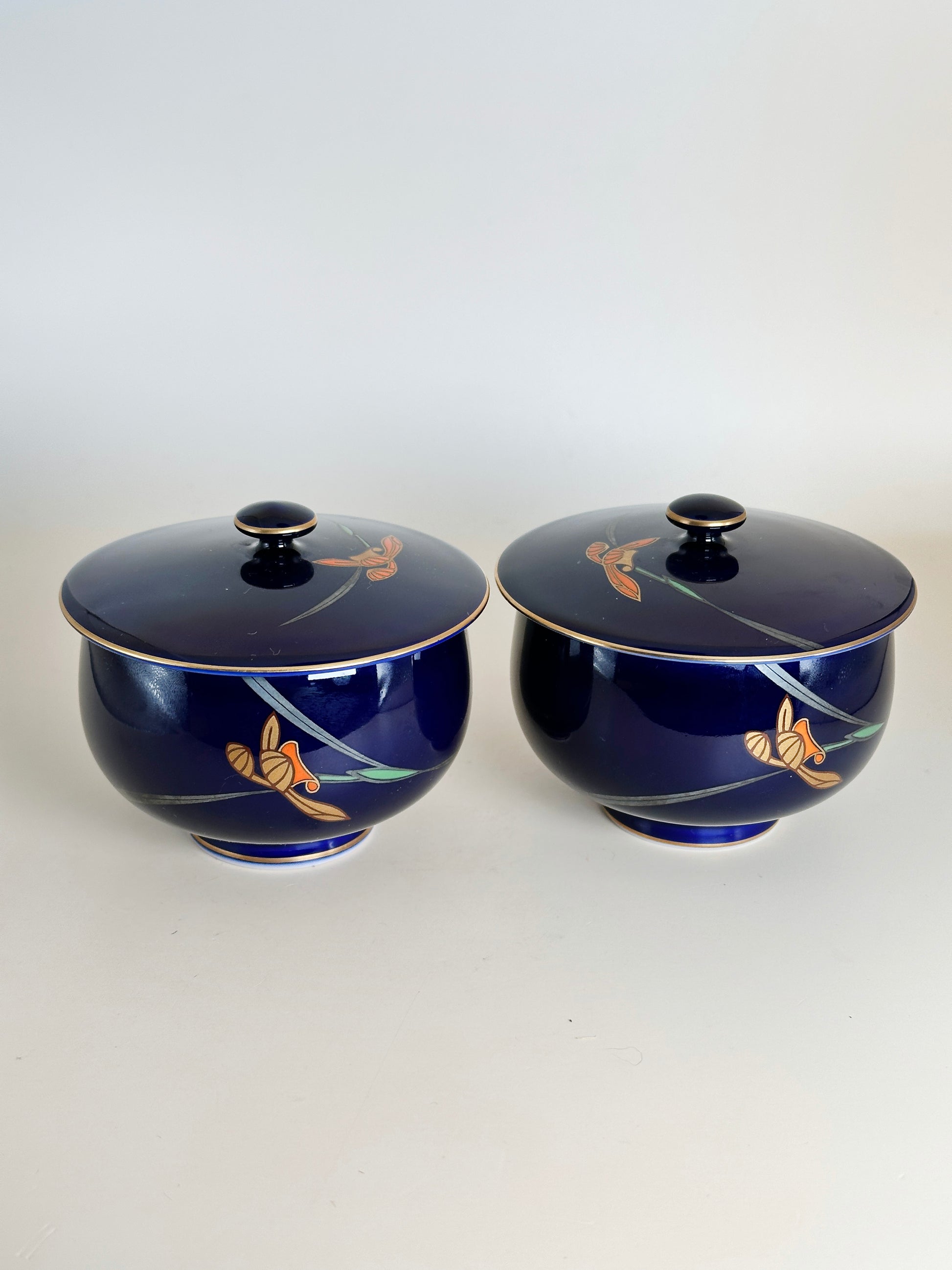 This elegant pair of lidded teacups exemplifies the refined artistry of Kōransha (香蘭社), one of Arita’s most esteemed porcelain kilns (有田焼) with a history dating back to the Edo period. Crafted from fine porcelain, each cup features a deep cobalt blue glaze accented with hand-painted floral motifs in gold and orange tones, delicately balanced with green leaf details. The lids mirror the design, creating a harmonious aesthetic that reflects traditional Japanese sensibility.