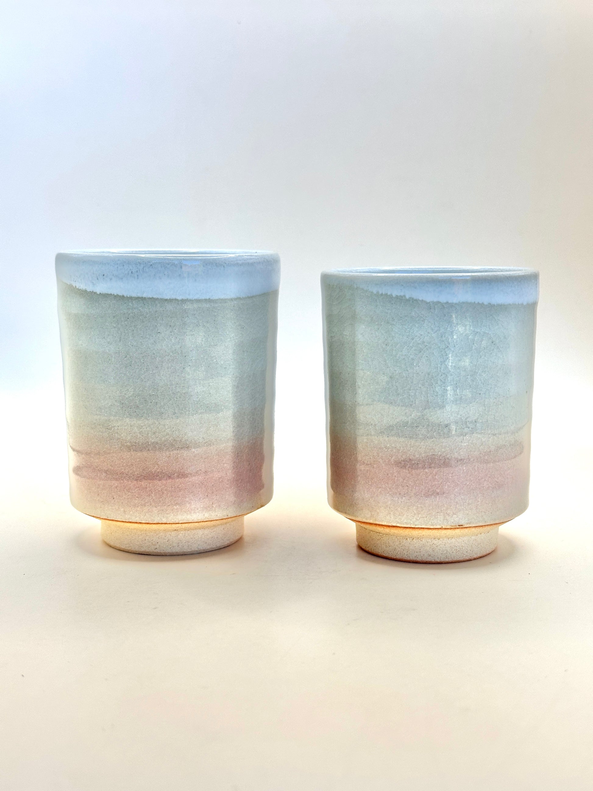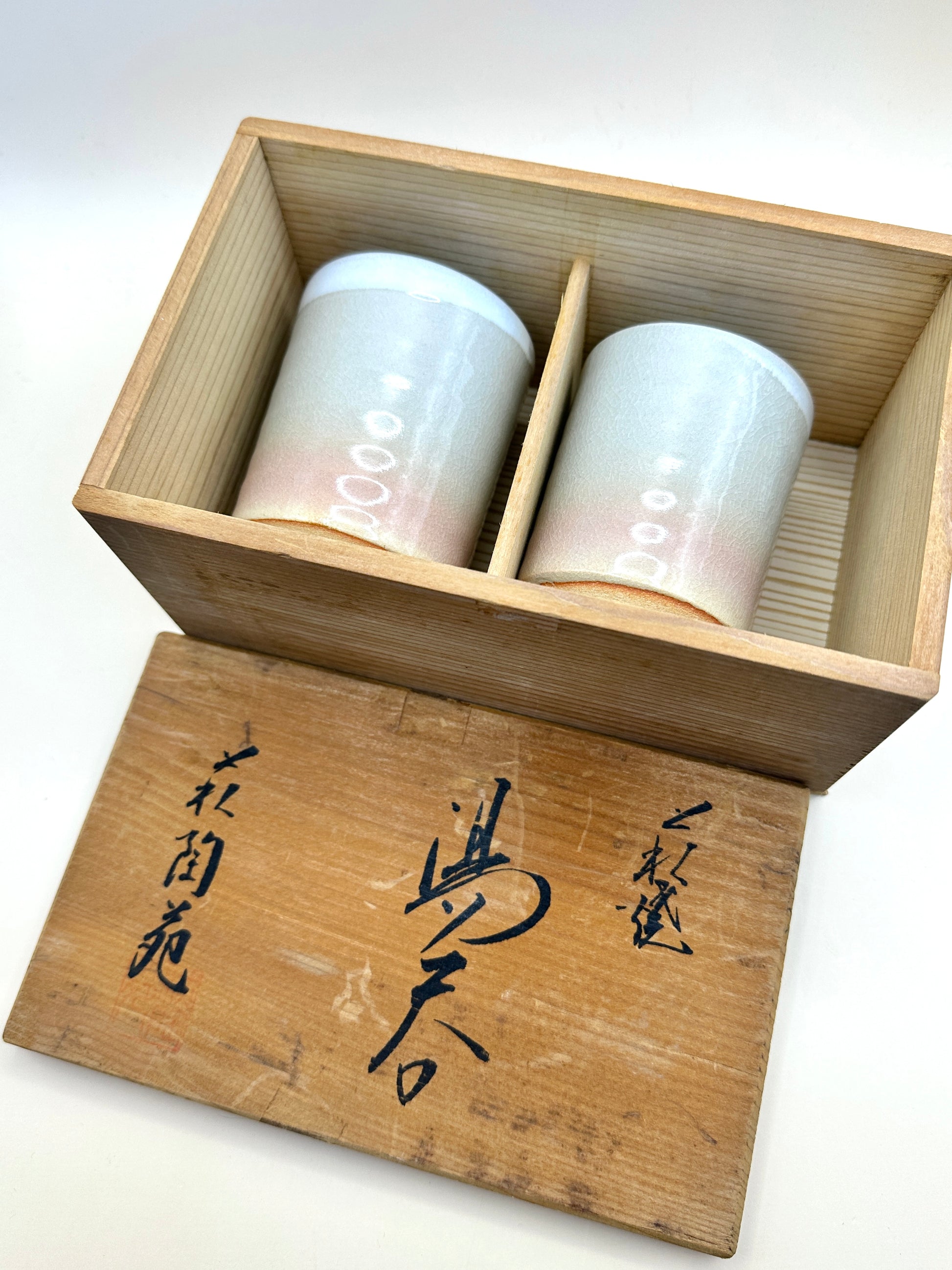 Vintage item never used. A pair of handcrafted Hagi-yaki (萩焼) tea cups, known as yunomi (湯呑), created by Tsubaki Shūen (椿秀窯) of Hagi Tōen (萩陶苑) in Yamaguchi Prefecture, Japan. Each cup displays the traditional elegance of Hagi ware, characterized by soft, natural glazing and subtle color transitions from pale blue to pinkish beige. The surface has a slightly crackled glaze — a signature of Hagi-yaki that develops character with use as it absorbs tea and ages gracefully.