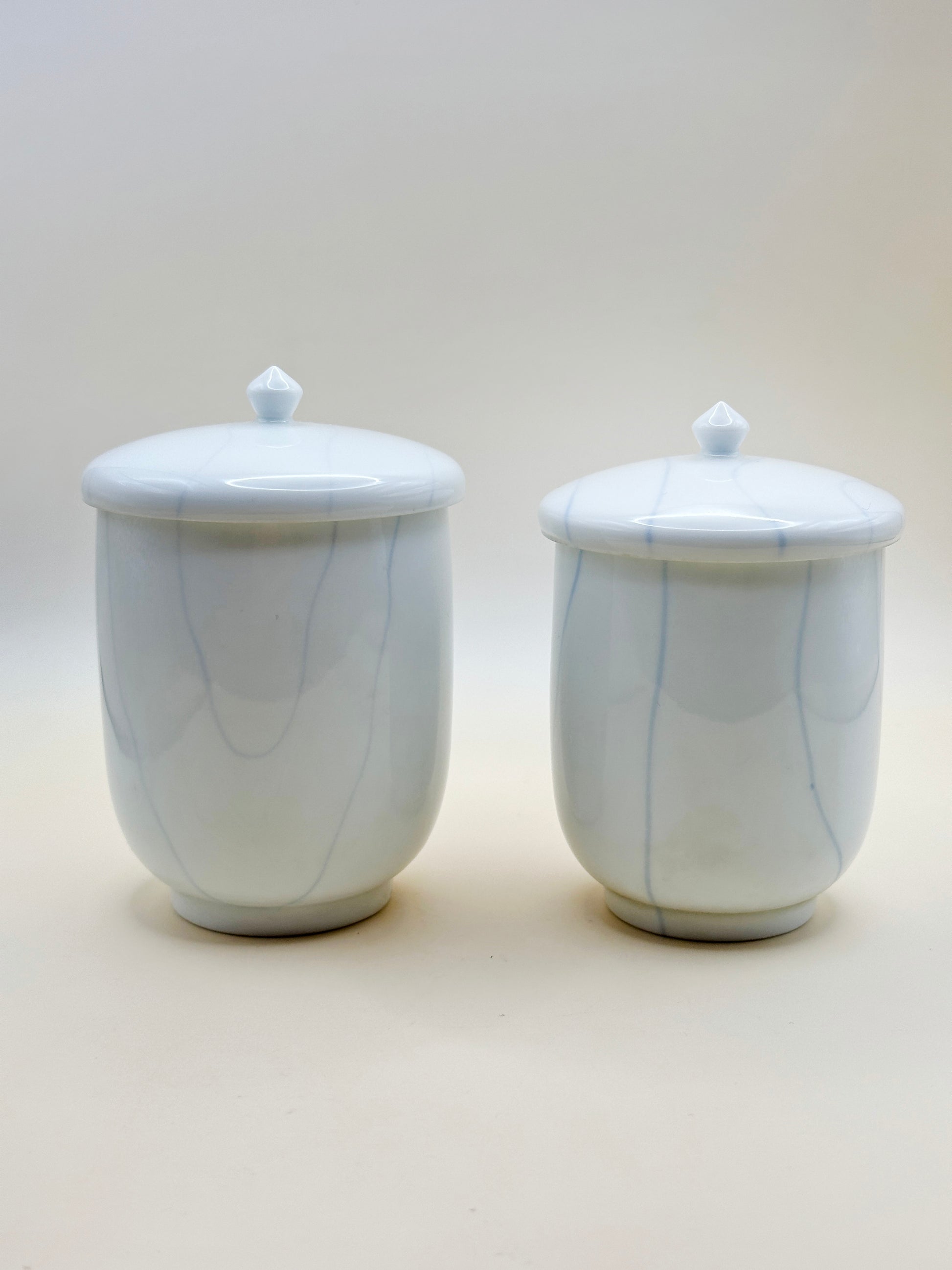 This pair of lidded tea cups is a fine example of Arita-yaki (有田焼) porcelain, created by the artisan Shuhō (秀峰). Each cup is elegantly shaped, with smooth, rounded contours that convey a quiet sense of balance and refinement. The porcelain is finished with a delicate, translucent glaze of soft white, traced with the faintest blue veining that adds depth and subtle movement to the surface.
