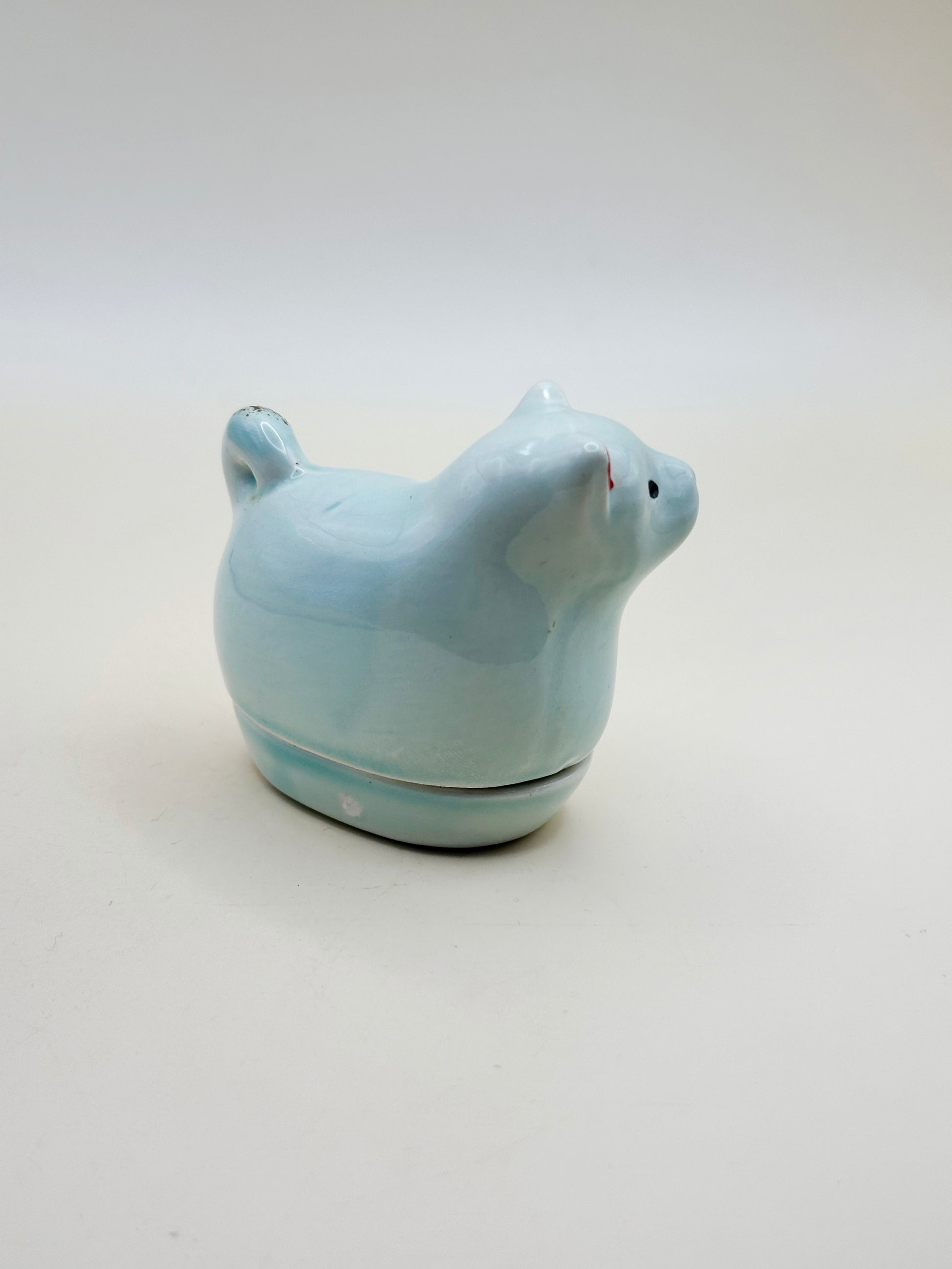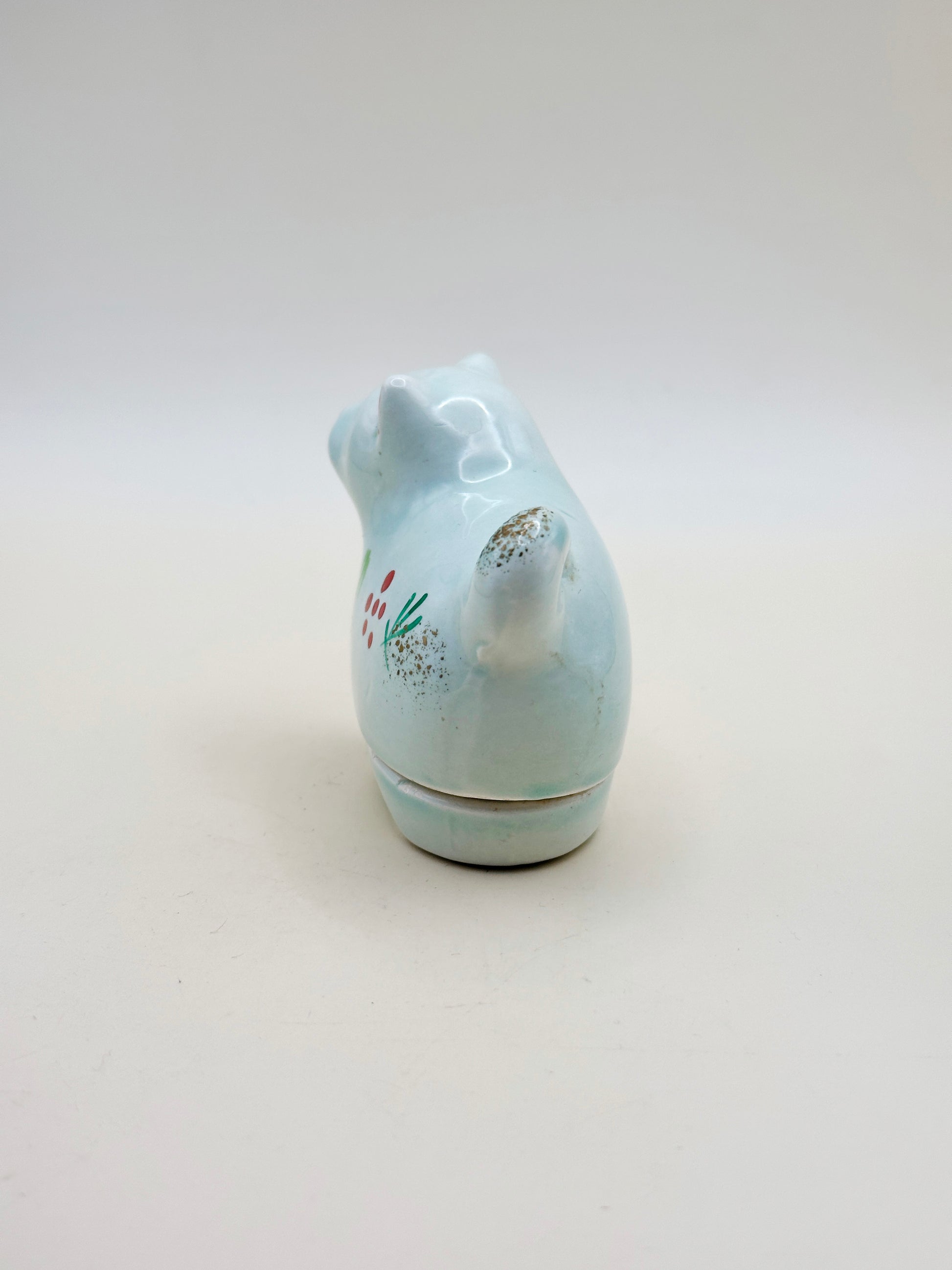 Finished in a soft blue-green celadon glaze (青瓷), this incense holder embodies a quiet elegance. The dog’s form is both endearing and symbolic, featuring hand-painted details in red, green, and gold, including auspicious motifs of pine and plum that signify renewal and longevity in Japanese culture.