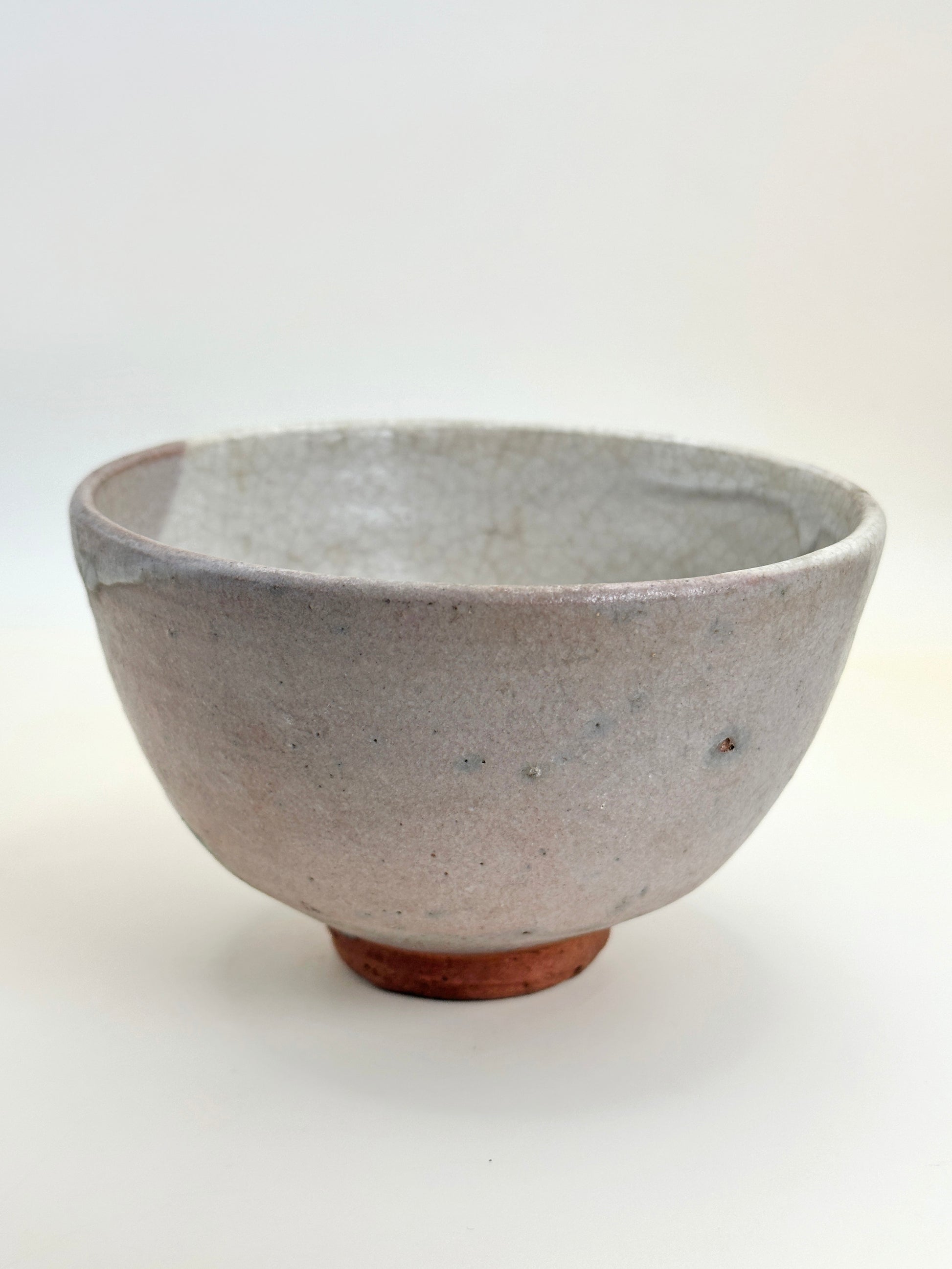 This chawan is a fine example of Karatsu-yaki (唐津焼) one of Japan’s oldest ceramic traditions, admired for its natural clay textures, understated beauty, and deep connection to the wabi-sabi aesthetic. Crafted from iron-rich Karatsu clay and finished with a soft, milky-gray glaze, the bowl displays a network of delicate 貫入 (kannyū) crackle lines that enhance its organic warmth and character.