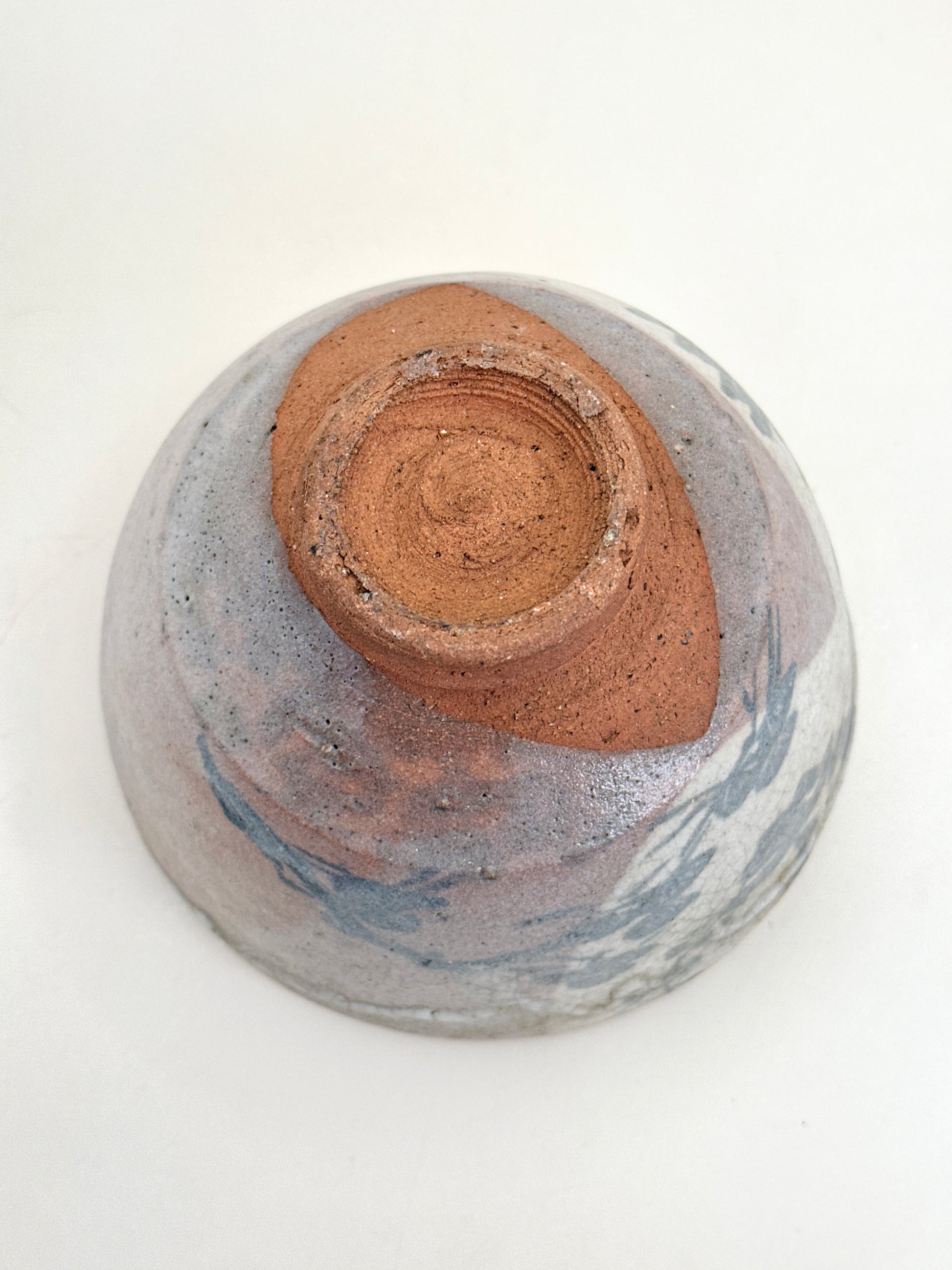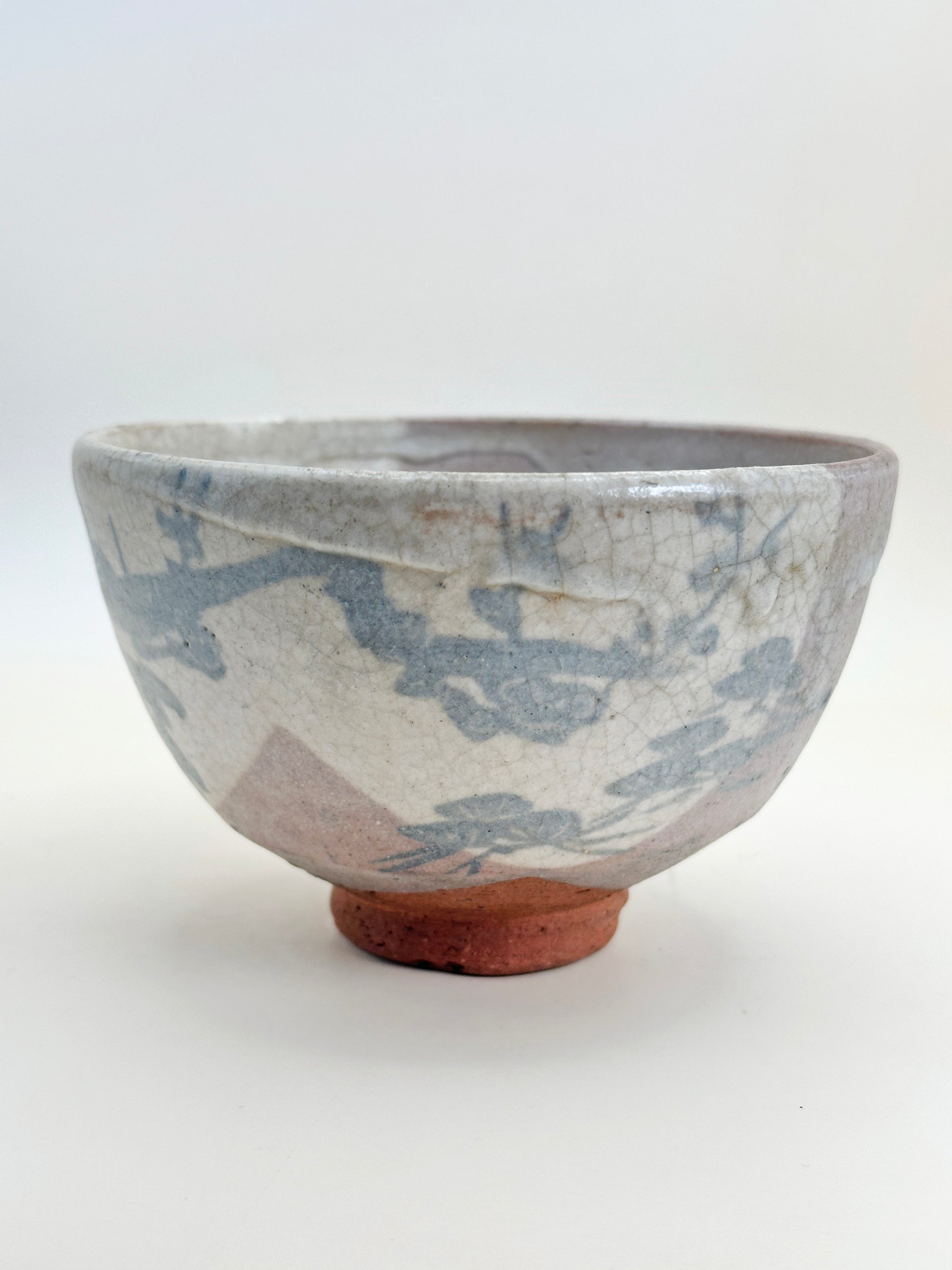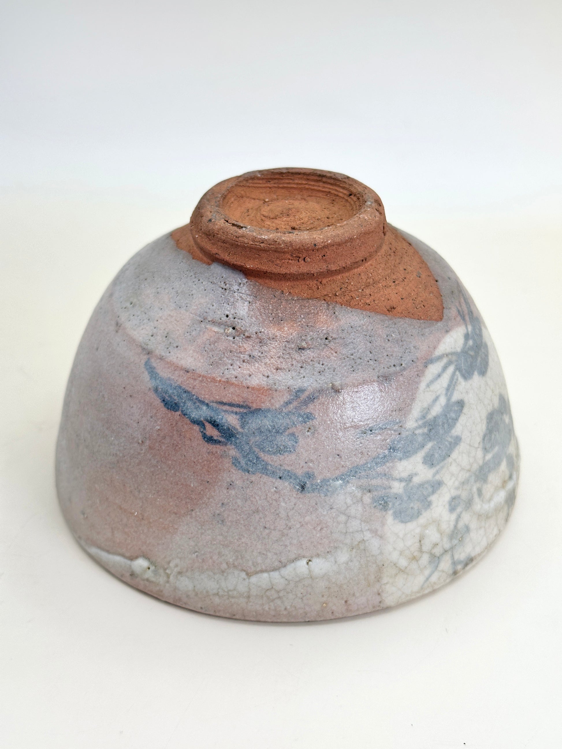 The bowl’s softly rounded form sits atop a warm, unglazed reddish Karatsu foot, grounding the piece with earthy authenticity. Subtle variations in glaze pooling, brushwork, and clay texture speak to traditional Karatsu handcrafting, where spontaneity and natural expression are valued as much as precision.
