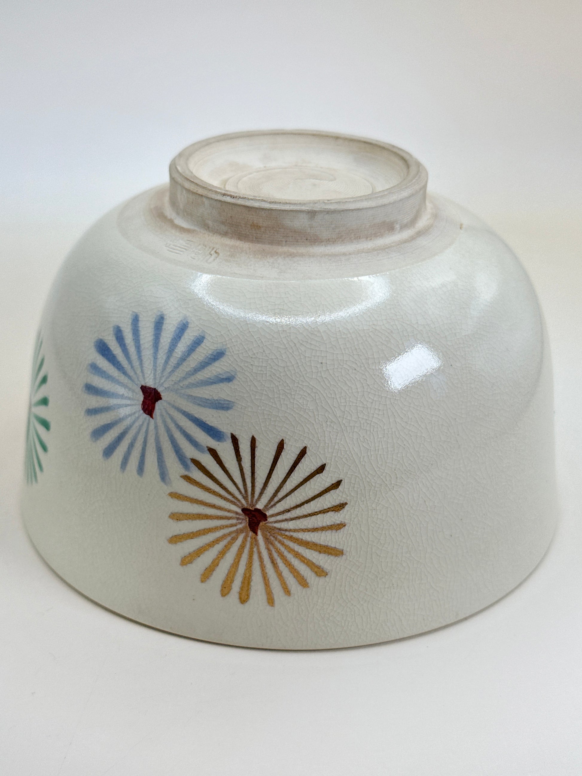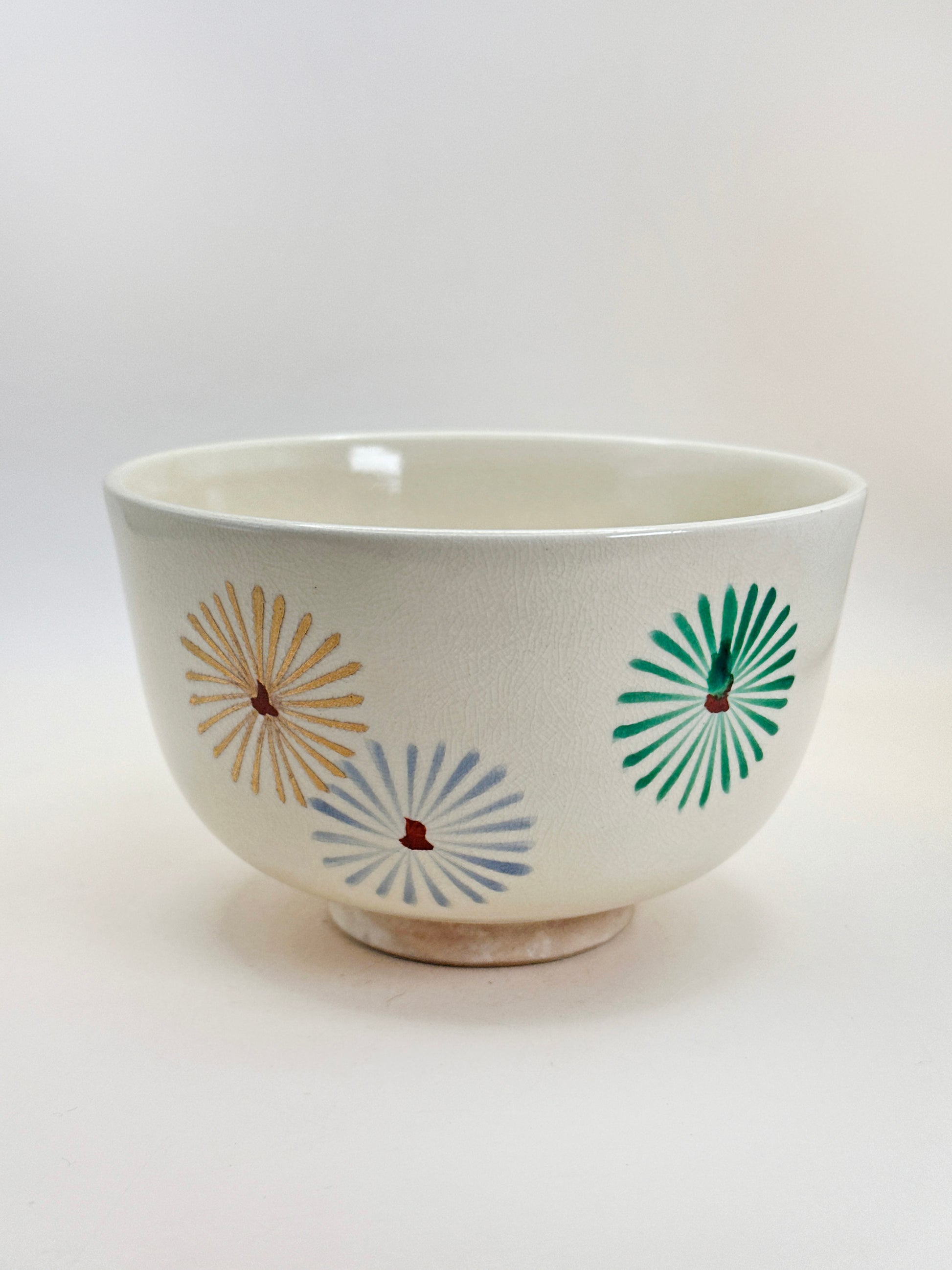 The soft, milky white glaze provides a calm and luminous ground, subtly textured with fine crackle that reveals itself under light. Across the exterior, delicate hand-painted motifs radiate outward like small bursts of light. Rendered in harmonious tones of gold, pale blue, and deep green, each motif resembles a stylized flower or firework, their rhythmic placement creating a gentle sense of movement around the bowl. The small touches of warm iron-red at the center of each design add depth and visual focus, demonstrating the careful brushwork characteristic of Kiyomizu-yaki decoration.