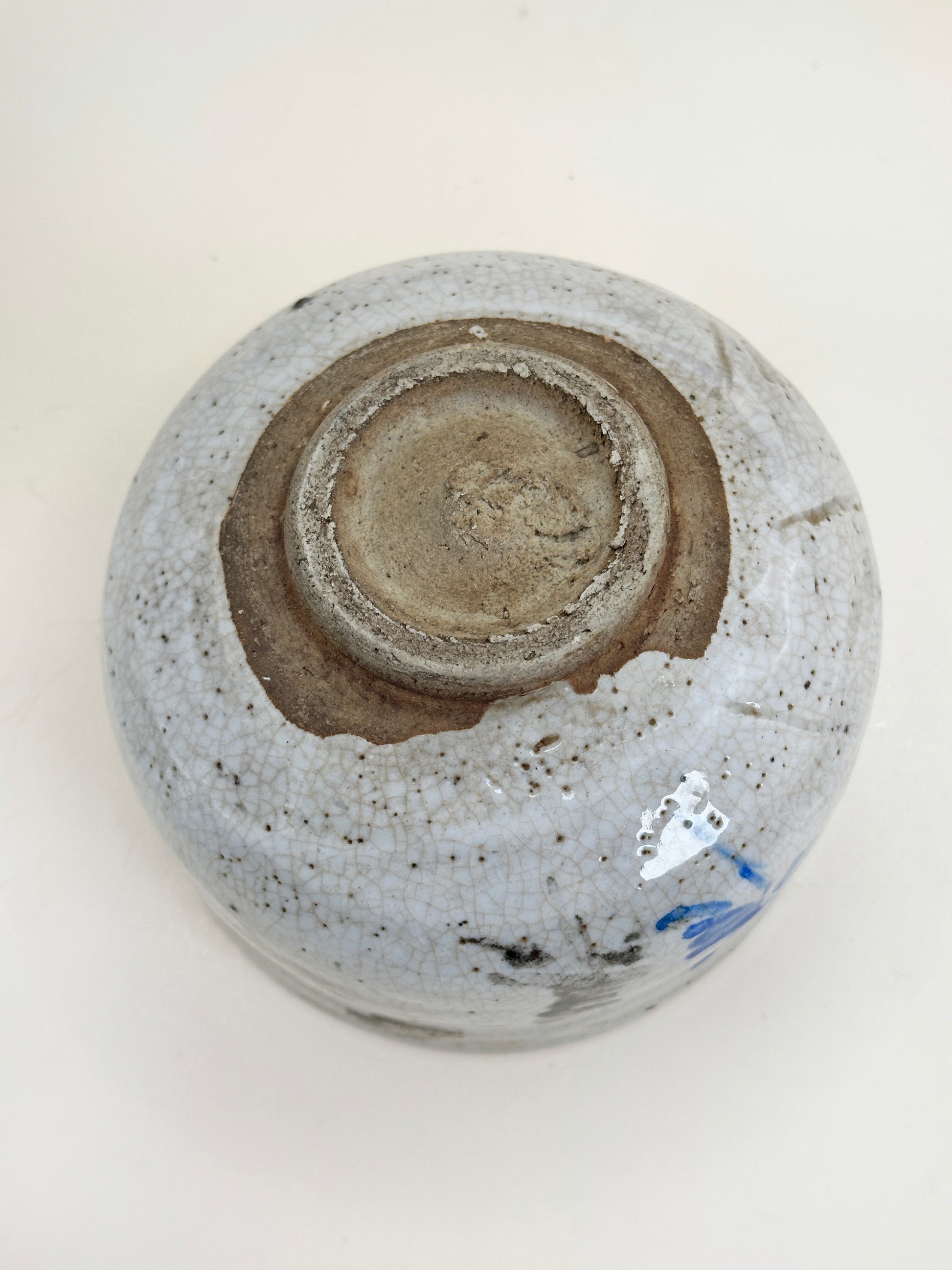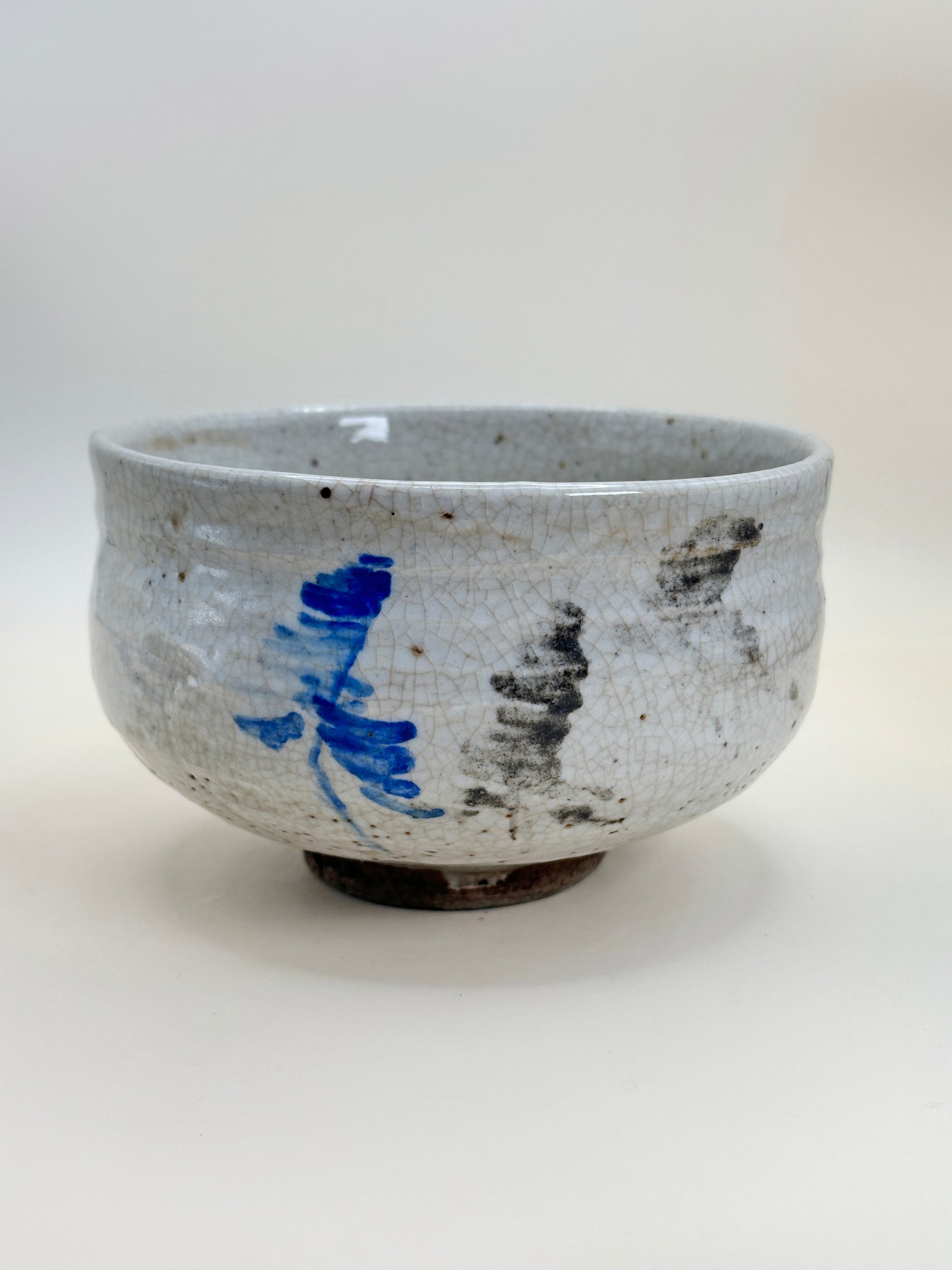 Decorative brushwork appears beneath the glaze in contrasting tones. A vivid cobalt-blue motif stands out with bold yet fluid strokes, while adjacent areas of soft iron-black pigment provide balance and restraint. The interplay between blue and black is understated rather than decorative in excess, allowing the painted elements to feel like spontaneous gestures rather than fixed patterns. This restrained asymmetry is a hallmark of Shino aesthetics, where suggestion and imperfection are valued over precision.