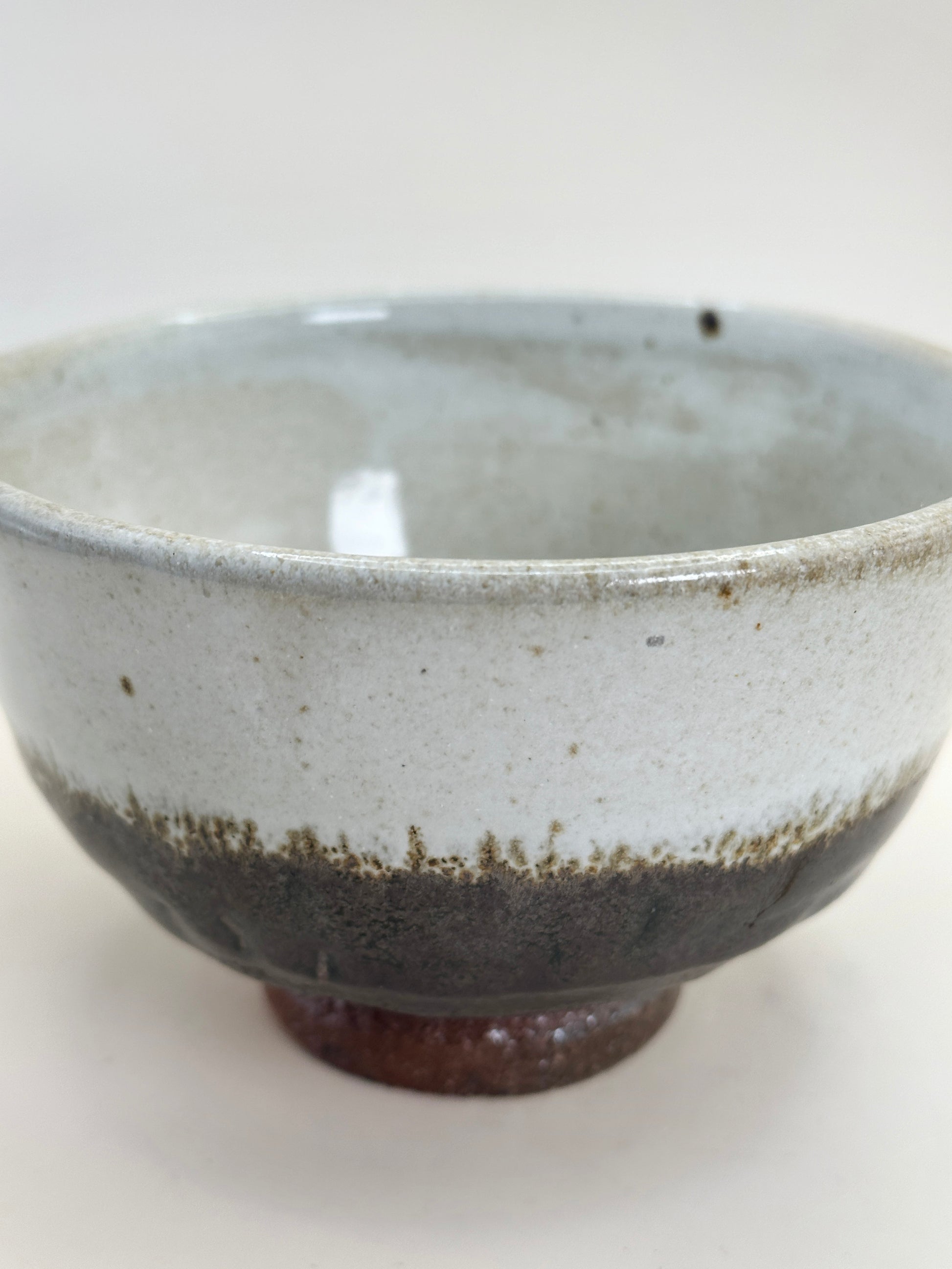 This Karatsu-yaki (唐津焼) matcha chawan exemplifies the classic beauty of Chōsen Karatsu (朝鮮唐津), a style celebrated for its dramatic yet natural contrast of glazes and its deep connection to the aesthetics of the tea ceremony. The bowl is defined by the characteristic two-tone glazing: a soft, milky white feldspathic glaze flows gently over a darker iron-rich glaze beneath, meeting in an irregular, organic boundary that speaks directly to the spontaneity of the firing process.
