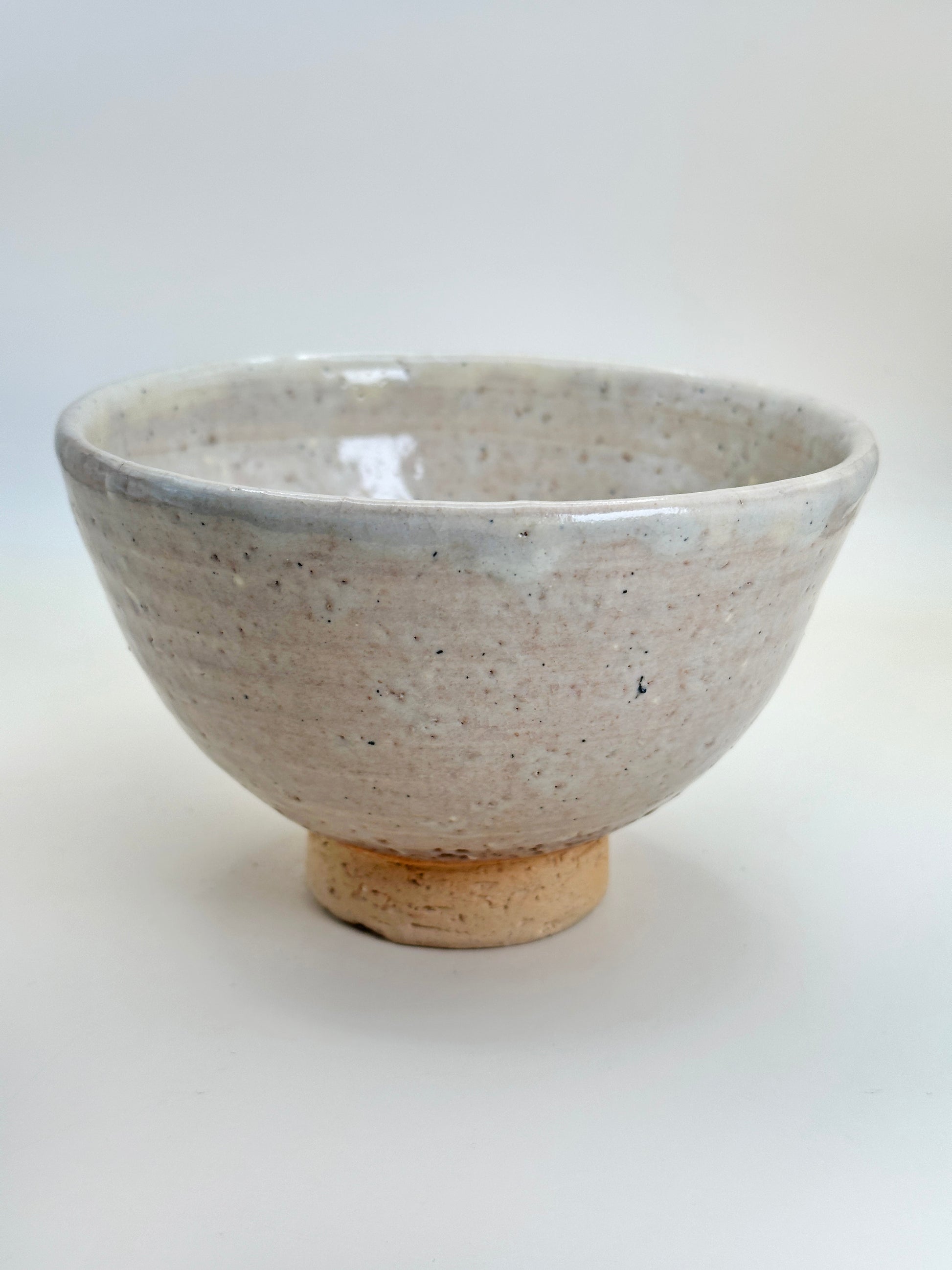 The surface is covered in a milky white Shino glaze with subtle pinkish and beige undertones, a hallmark of the style. Fine iron speckles are scattered throughout, adding depth and visual interest, while faint horizontal traces from the potter’s wheel remain visible beneath the glaze, giving a sense of movement and handwork. In places, the glaze thins and pools unevenly, revealing the earthy clay body below and creating gentle transitions of tone and texture.