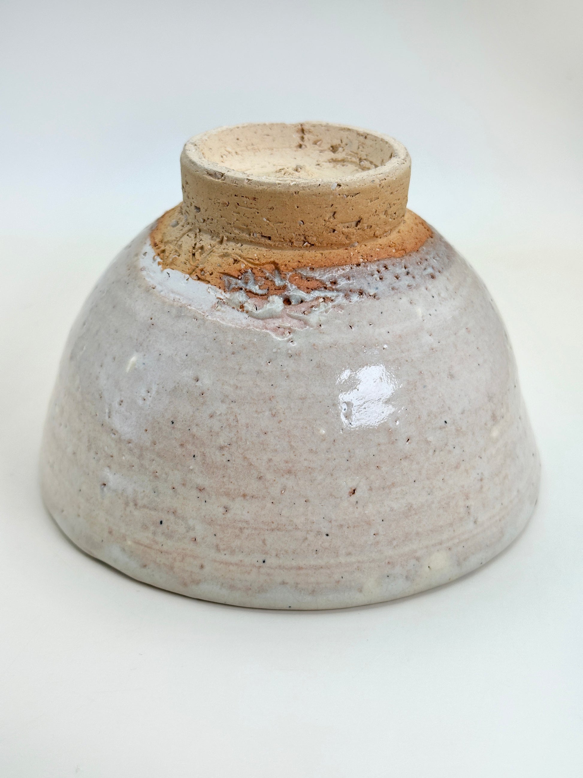 The foot is deliberately left more exposed, showing the coarse, sandy clay typical of Shino ware. Around the base, the glaze breaks and retreats, revealing warm, fired clay and subtle kiln marks that speak to the natural firing process. This contrast between the soft, luminous glaze and the raw clay foot adds balance and grounds the piece visually.