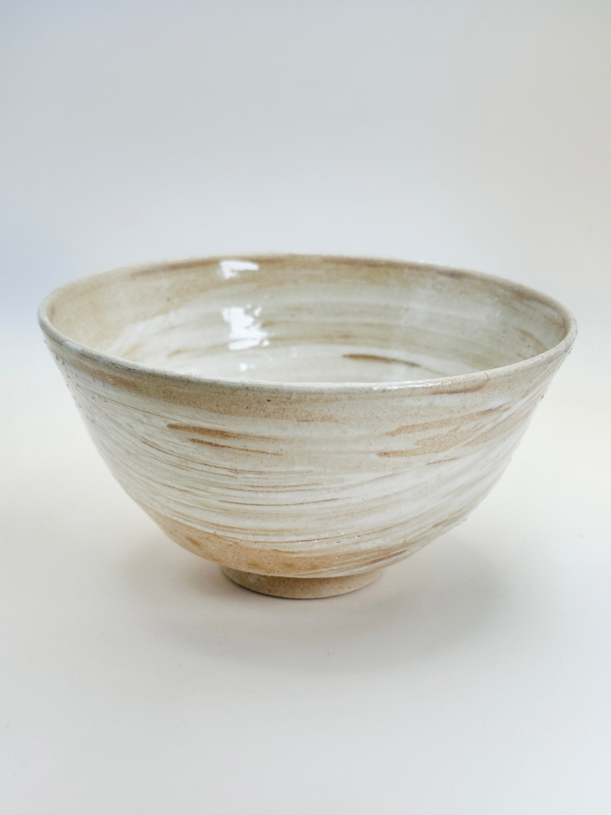 Fine crackle (貫入) can be seen across the glazed surface, adding depth and a sense of quiet age, while the interior reveals concentric wheel marks that draw the eye toward the center of the bowl. These traces reinforce the bowl’s handmade character and the meditative process behind its creation.