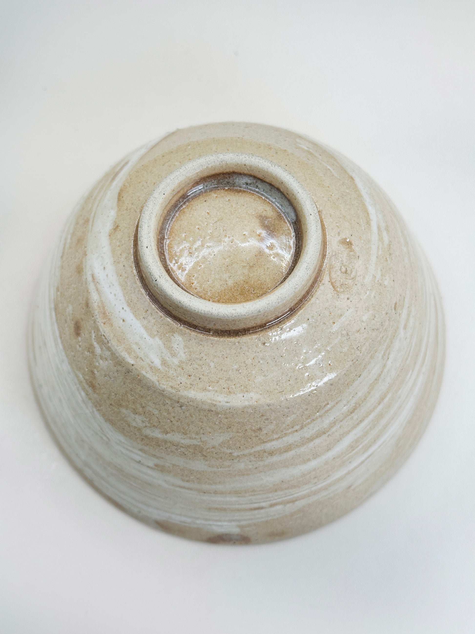 Vintage item, never used. This matcha bowl chawan in the Hakeme (刷毛目) style conveys a calm, understated beauty rooted in the aesthetics of Korean-influenced tea ceramics that were deeply admired in Japan. The form is gently open and well balanced, with softly flaring walls that sit comfortably in the hands, making it both visually pleasing and practical for the preparation of matcha.