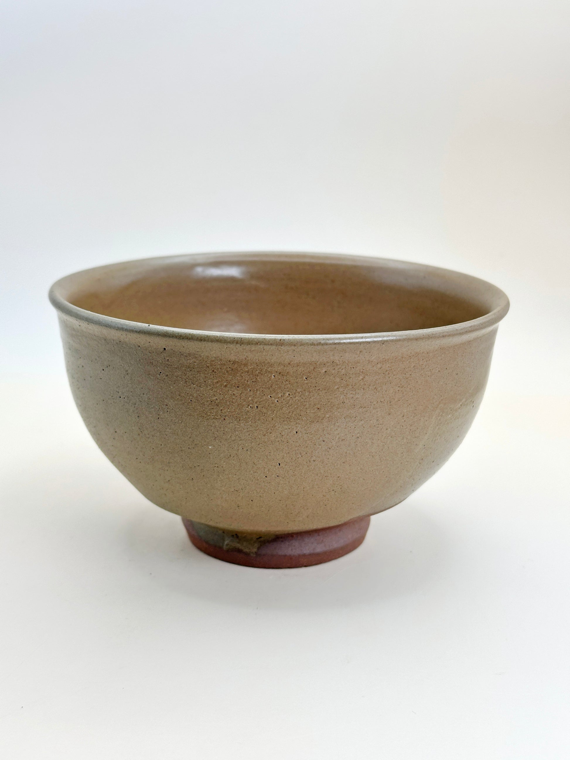 The foot is deliberately left unglazed, showing a reddish-brown clay typical of Tokoname ware. This contrast between glazed and bare surfaces highlights the craftsmanship of the potter and reinforces the bowl’s honest, utilitarian character.