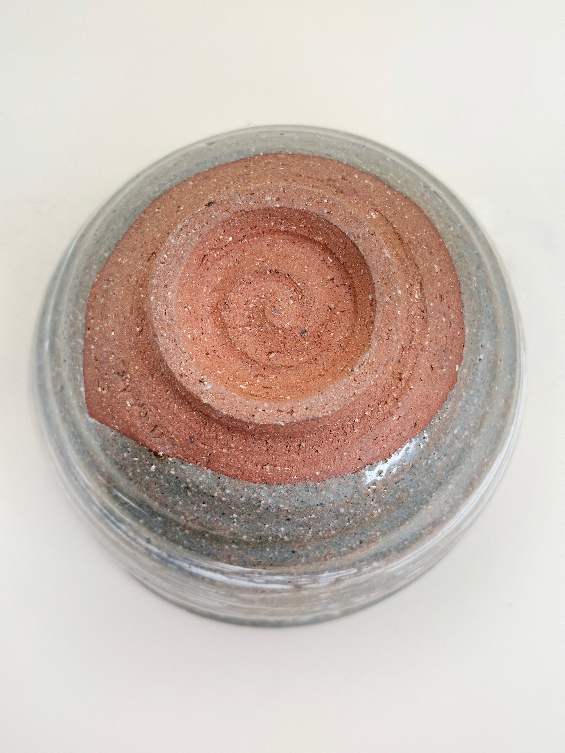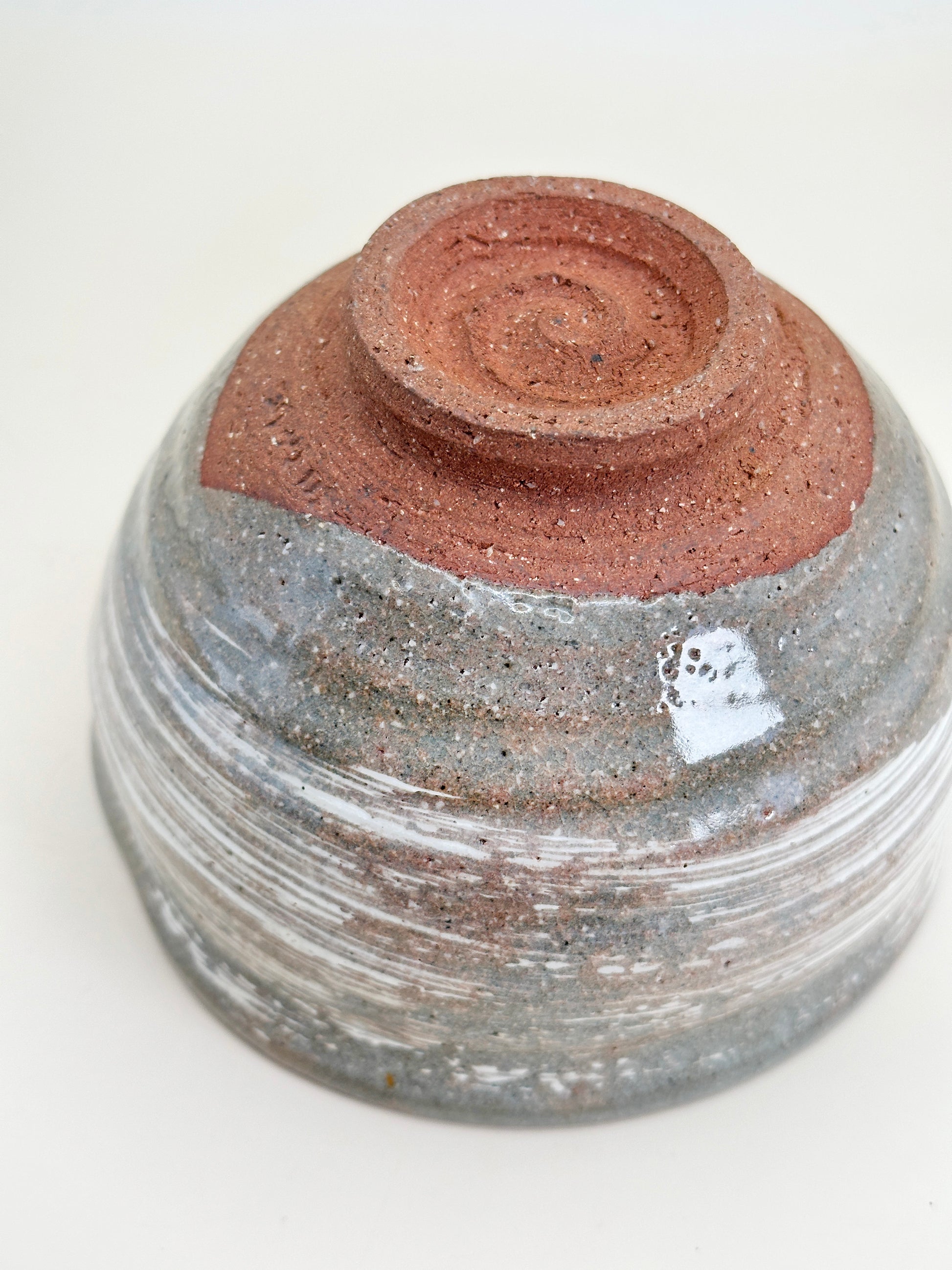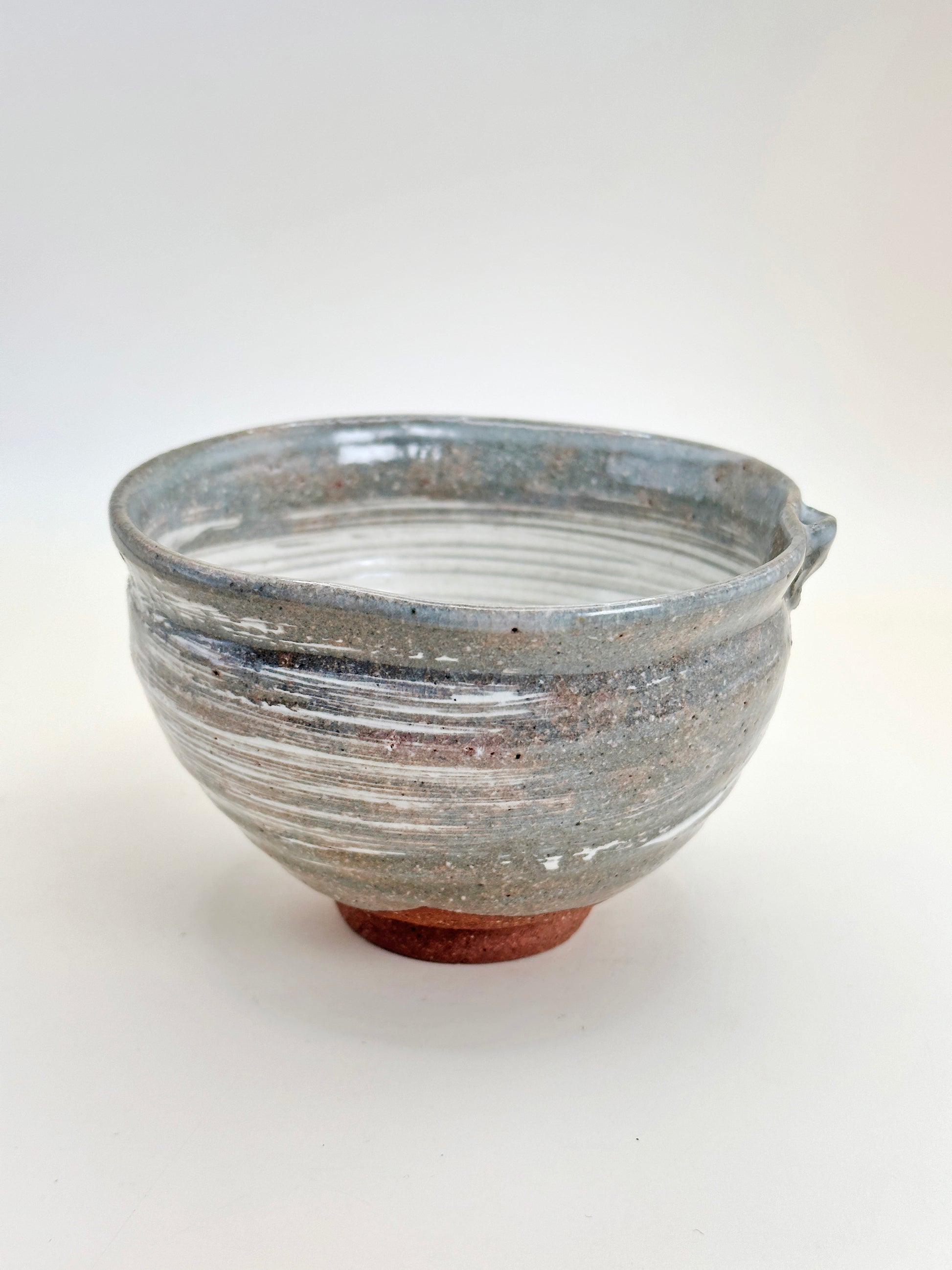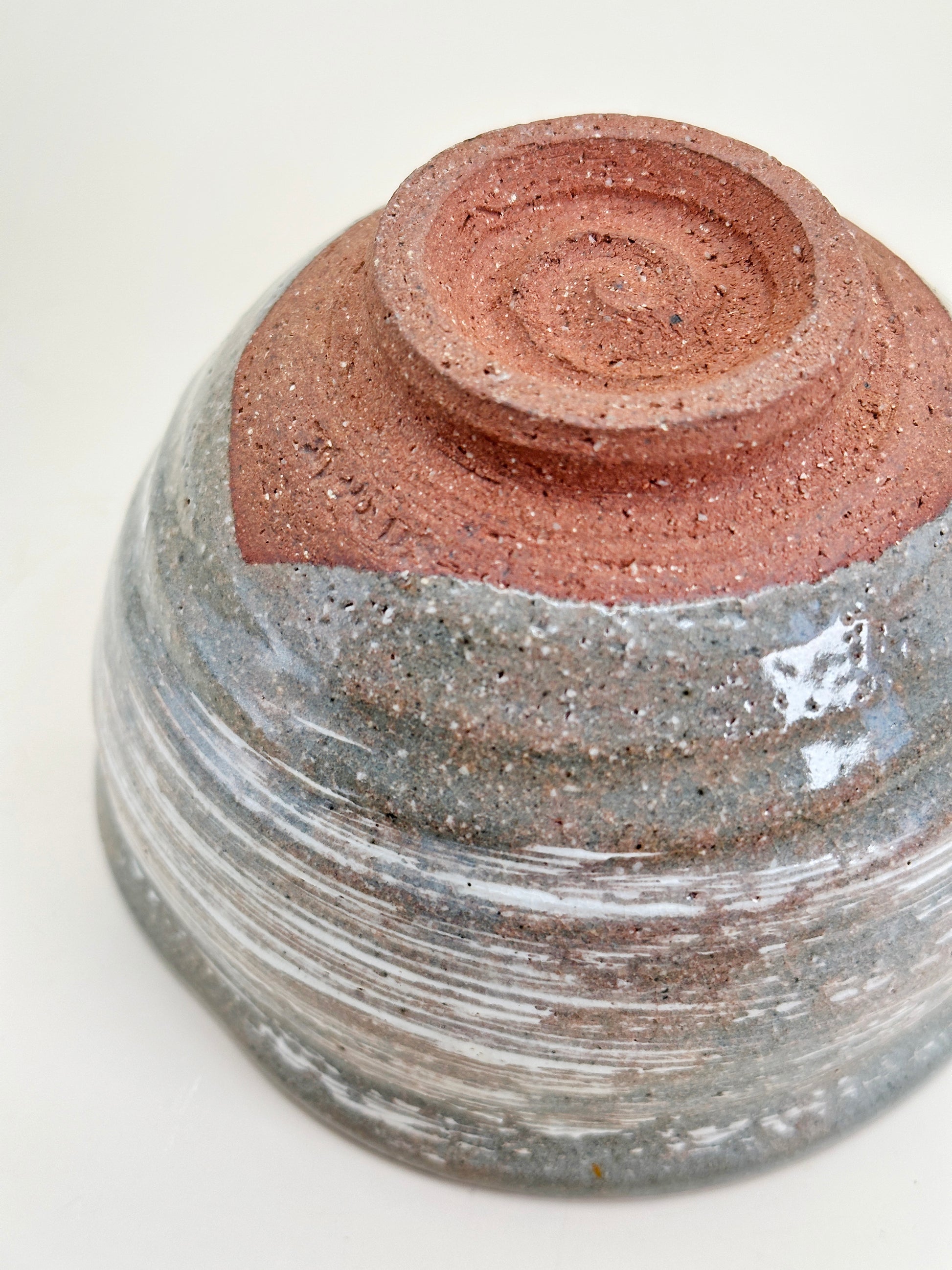 The foot is left unglazed, exposing warm reddish clay that grounds the bowl visually and physically. This contrast between the brushed slip and raw clay enhances the tactile experience and reflects the wabi-sabi sensibility central to the tea ceremony—beauty found in imperfection, movement, and restraint.