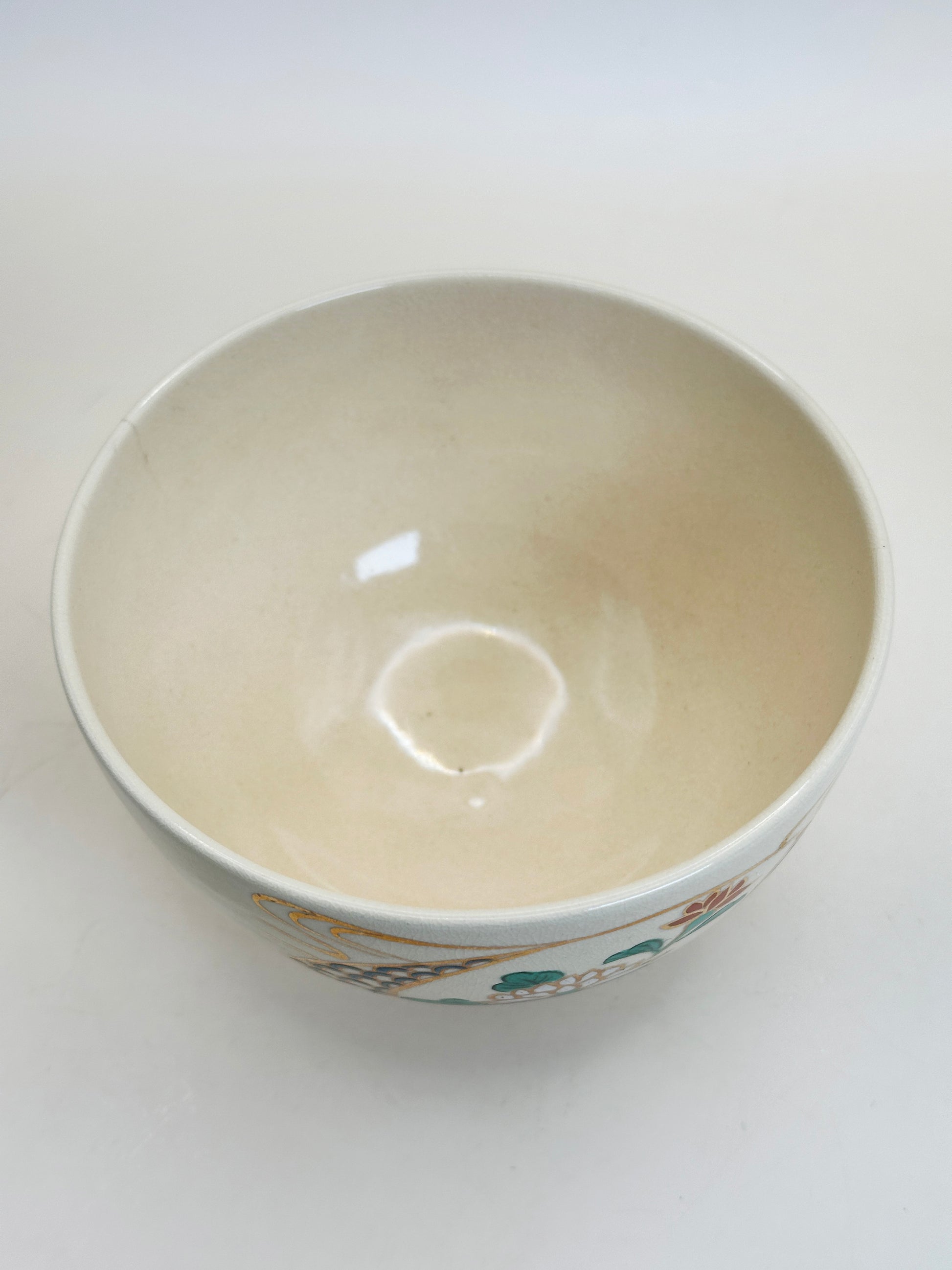 The interior remains largely unadorned, allowing the vibrant green of whisked matcha to stand out beautifully, while the modestly trimmed foot grounds the piece with understated dignity. Overall, this chawan embodies the refined elegance of Kyoto ceramics, where decorative sophistication and functional harmony meet, making it well suited both for use in the tea ceremony and for appreciation as a work of art.