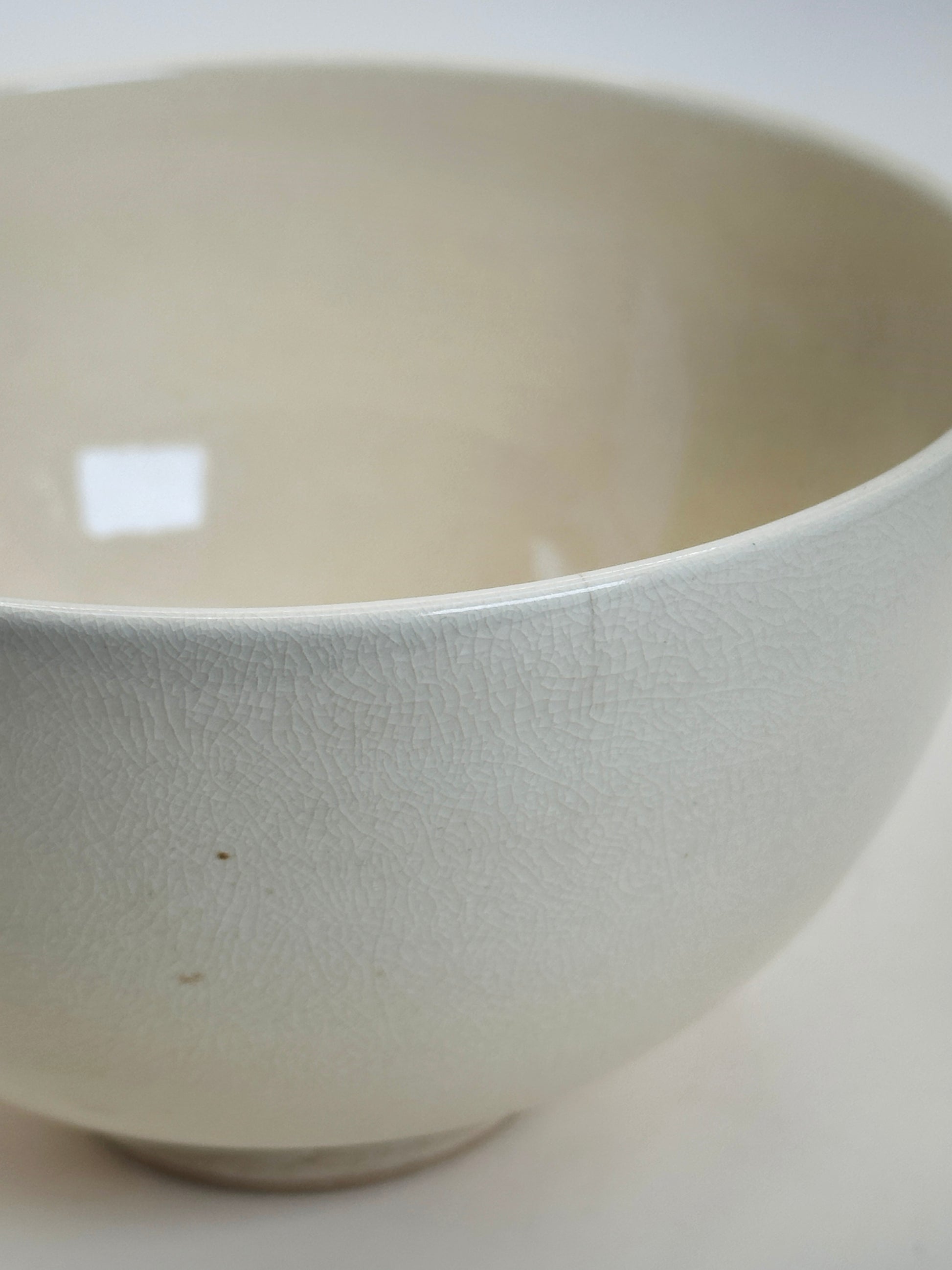 This vintage 京焼(Kyō-yaki)chawan is an elegant example of Kyoto’s refined ceramic tradition, created by Katō Shōzan 加藤昌山. The bowl is formed with a well-balanced, gently flaring profile that sits lightly in the hands, reflecting the Kyoto aesthetic of grace and restraint. Its warm ivory-toned glaze provides a soft, luminous ground, subtly pooling toward the foot and revealing a fine, quiet crackle that speaks to age and careful firing.