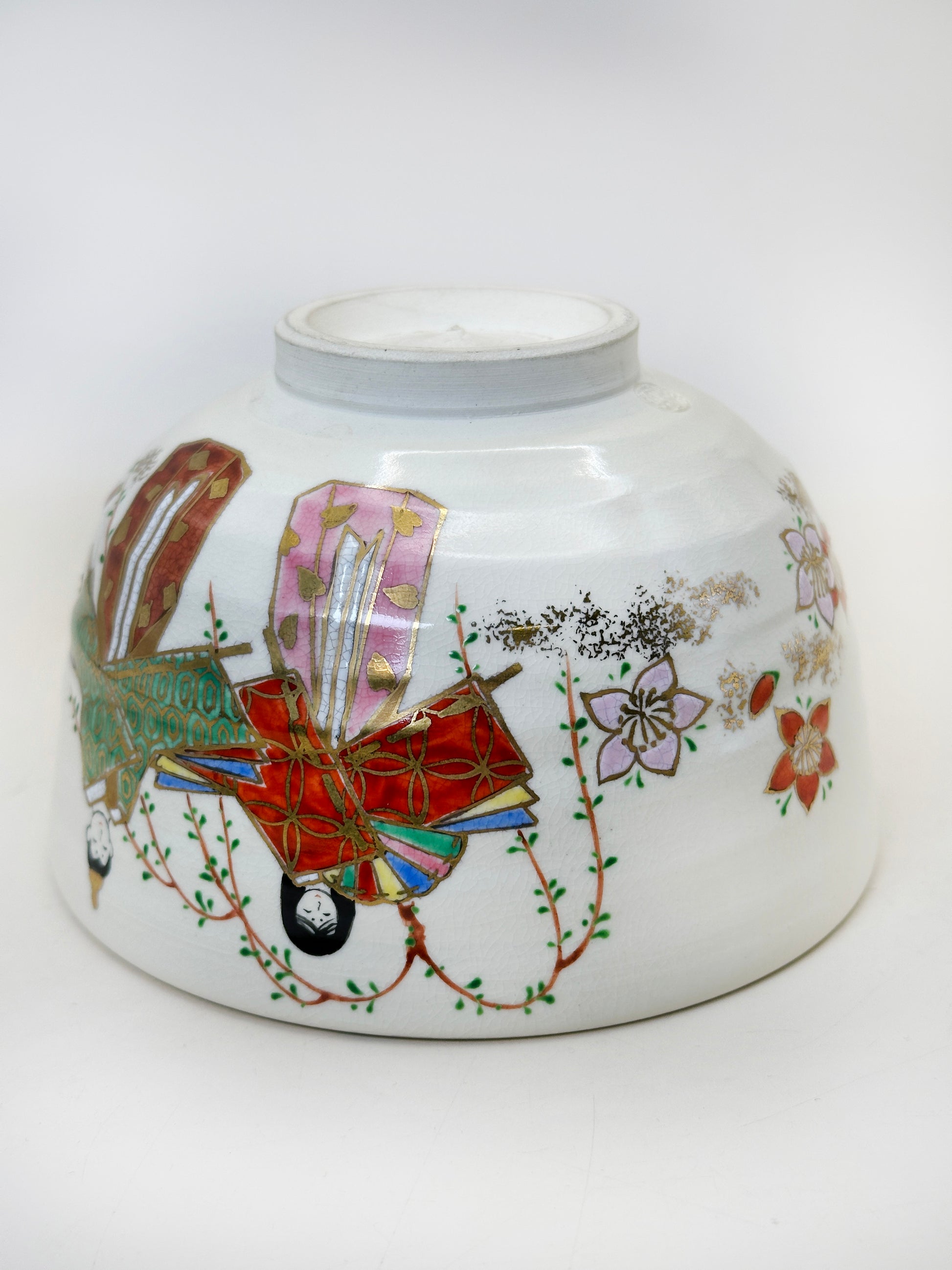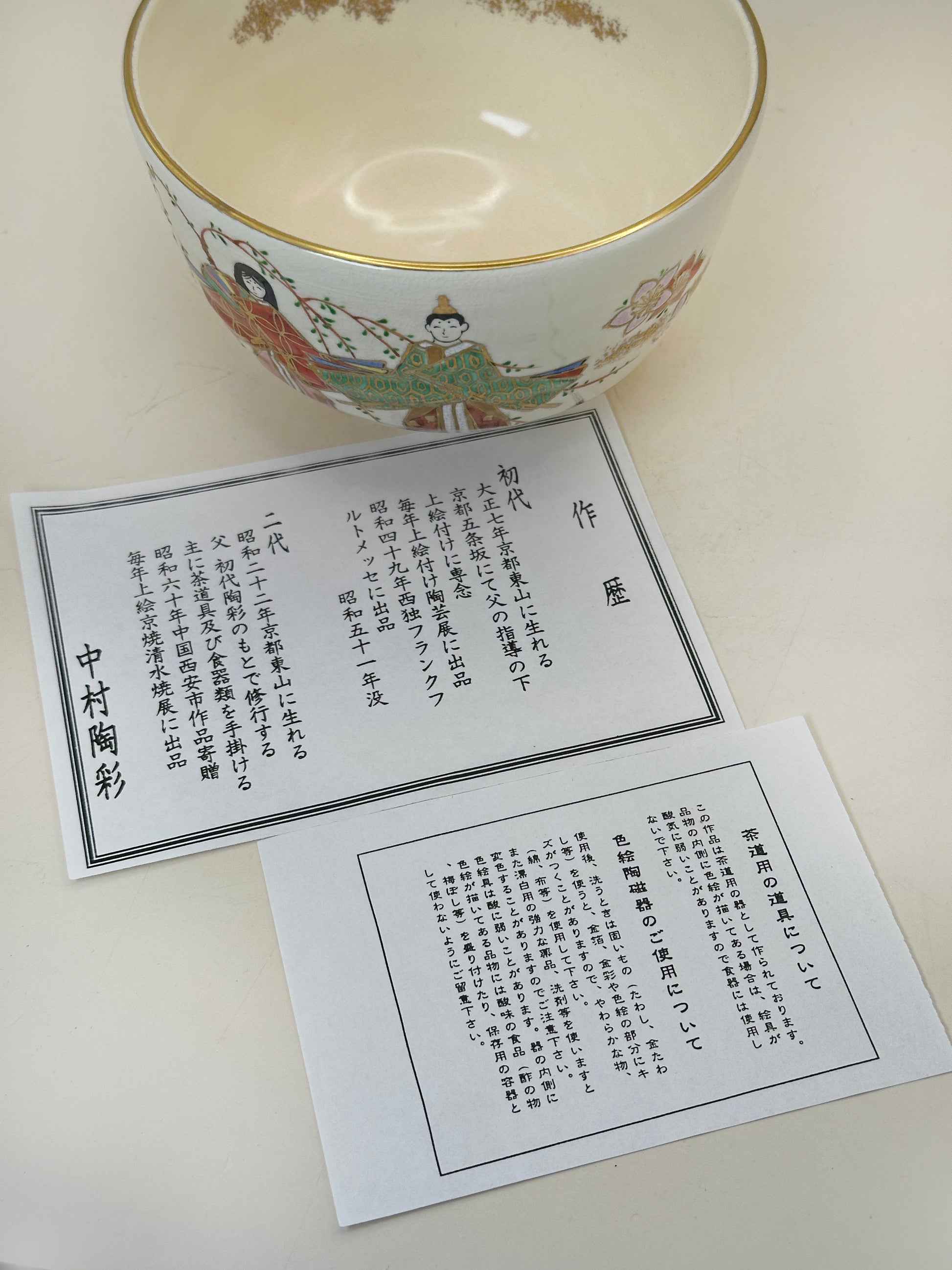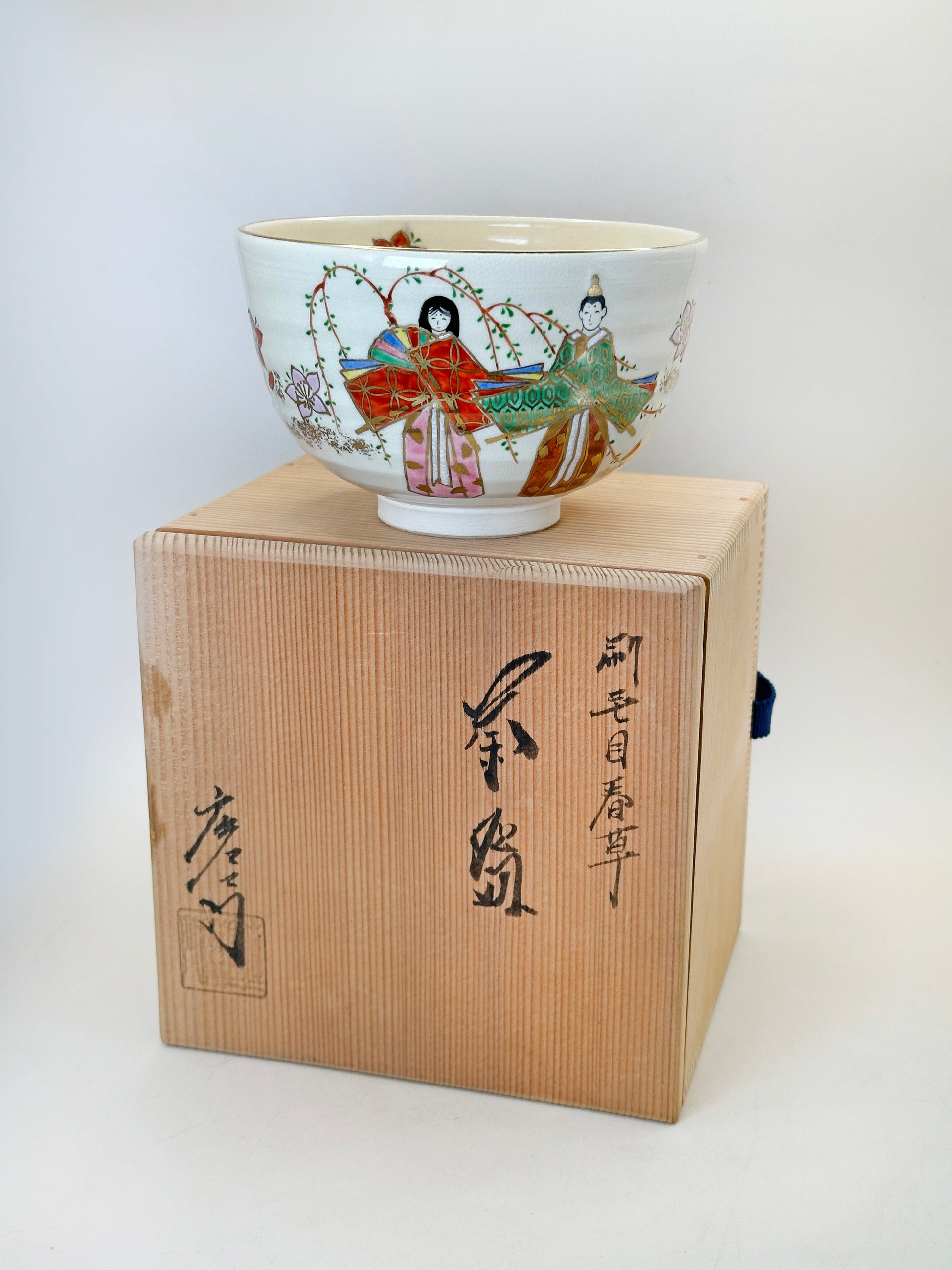This chawan is both a functional tea vessel and a celebratory seasonal piece, particularly suited for spring tea gatherings and Hinamatsuri-themed occasions, embodying the elegance and narrative beauty of Kyoto ceramic art.