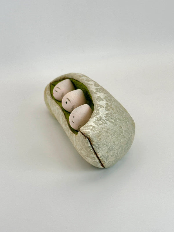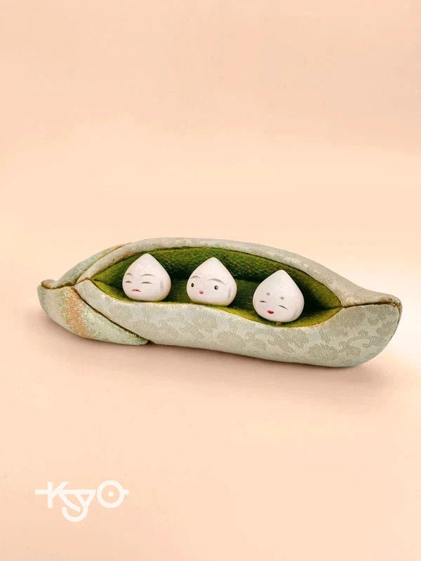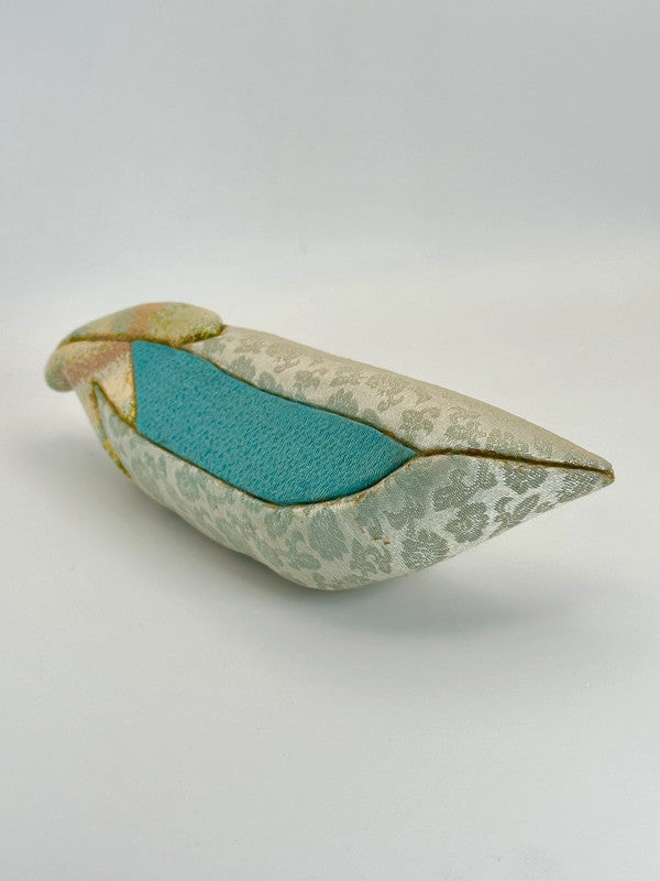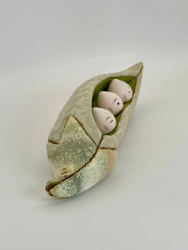 This charming folk craft piece is a delightful example of creative artistry using Nishijin-ori (西陣織), a traditional Kyoto textile known for its rich patterns, intricate weaving techniques, and luxurious silk threads. The piece features a soft sculpture of a pea pod, carefully crafted from pale green Nishijin-ori fabric with subtle floral and geometric motifs that showcase the fabric's elegance and sheen.