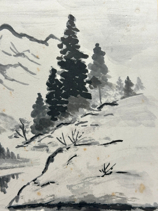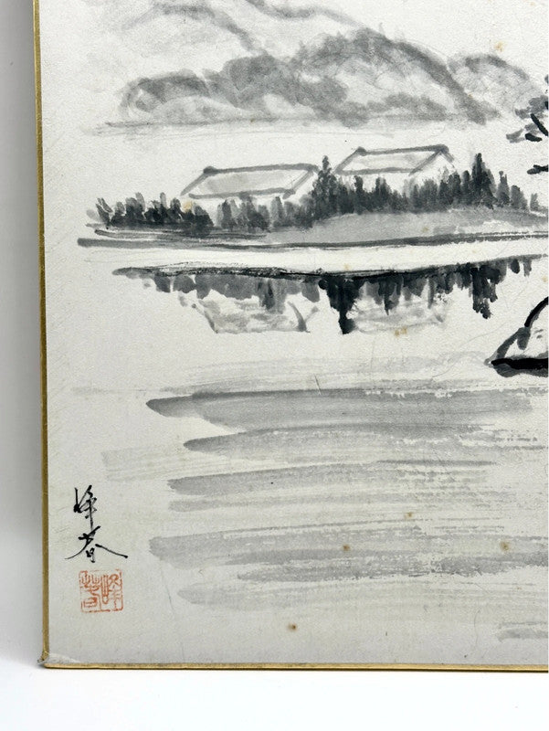This vintage Japanese shikishi board features a stunning sumi-e (墨絵) ink painting of a tranquil mountain landscape. Executed in delicate brushwork with subtle gradations of black ink, the artwork captures the essence of Japanese Zen aesthetics, where simplicity and harmony with nature are paramount.