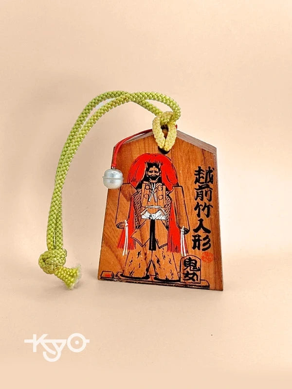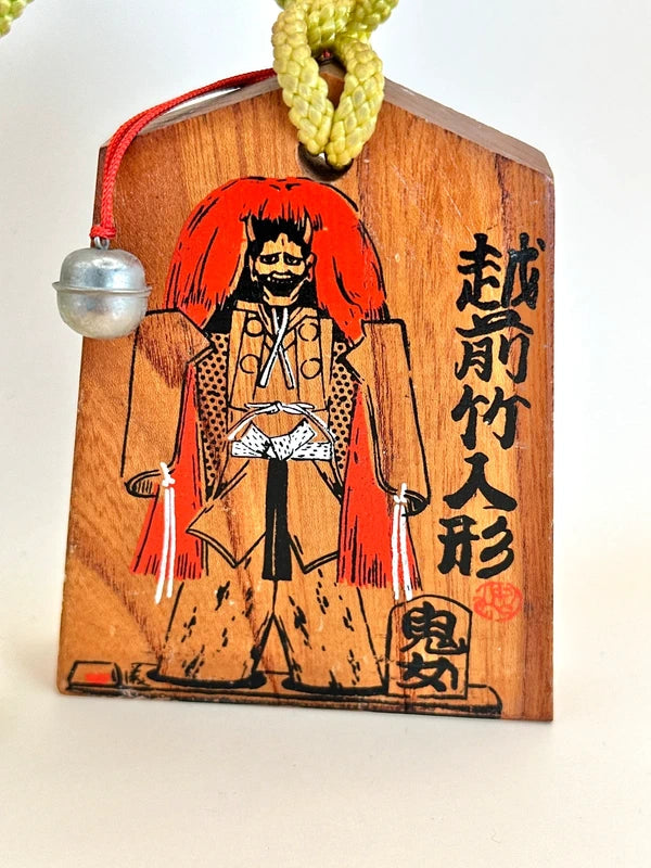 A historic hot spring town located in Fukui Prefecture. The front side is a bold illustration of a bamboo warrior doll (越前竹人形) representing a 鬼女 (kijo) — a mythical demon woman from Japanese folklore. The kijo is often depicted as a tragic or vengeful female spirit, sometimes born from sorrow or betrayal, and this doll reflects that dual nature: elegant and fearsome.