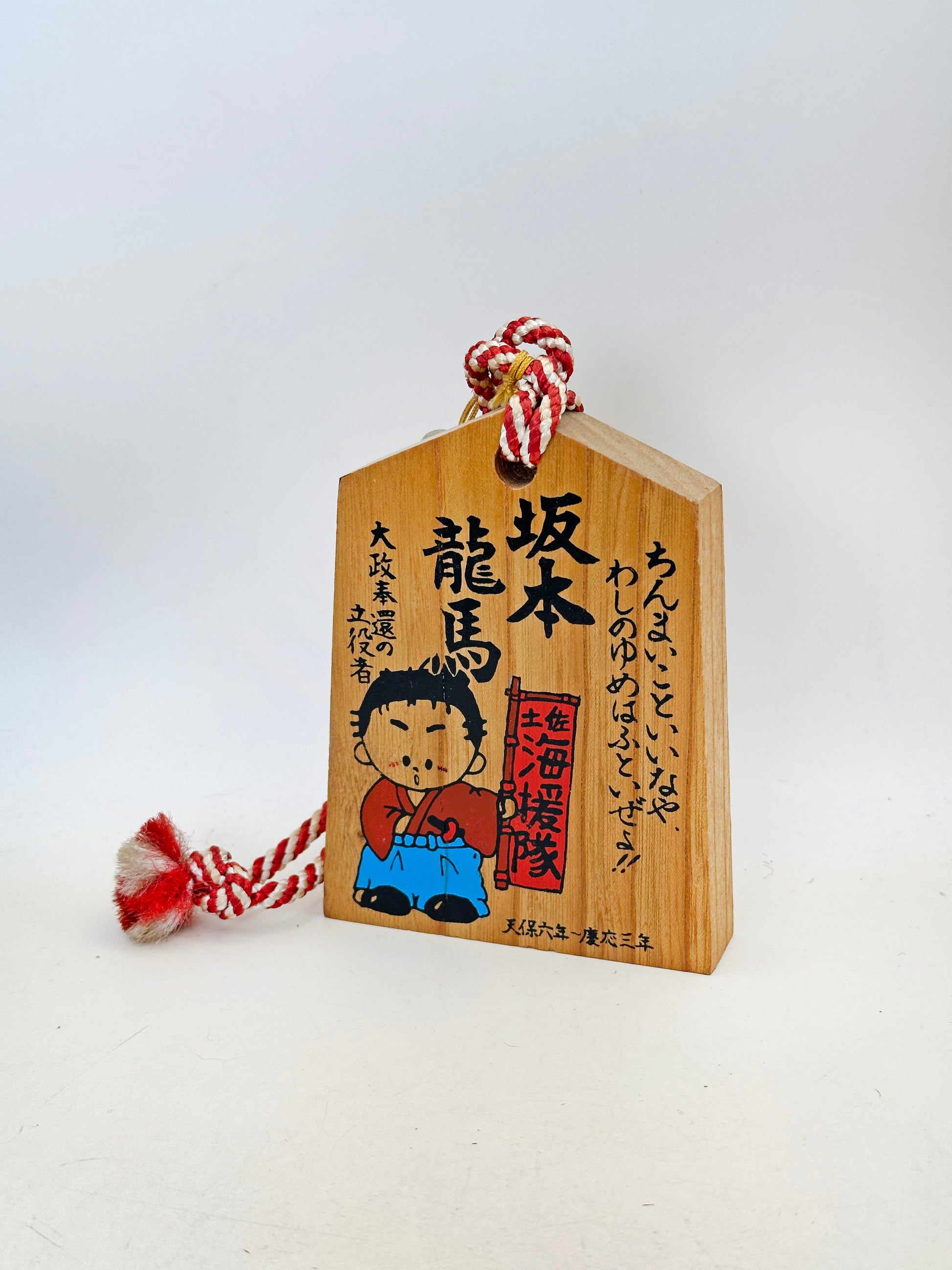 Crafted from warm-toned wood and finished with a traditional red-and-white braided cord and small protective bell, the front prominently features bold calligraphy reading 坂本龍馬. Beside the inscription is a delightful illustrated figure of Ryōma in simplified folk style, dressed in kimono and hakama, holding a small object with an earnest expression. A red banner beside him references 土佐海援隊, the maritime trading and political organization Ryōma founded during the final years of the Edo period.